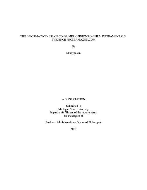 "This study examines whether online consumer product reviews contain information that is associated with firms' earnings and stock returns around earnings announcements. Ex ante, it is unclear whether consumer reviews are useful to investors because consumer reviews have not been easily accessible or widely disseminated. Based on 18,794,143 consumer reviews posted on Amazon.com during 1996-2014, I construct quarterly measures of abnormal tone and abnormal rating of consumer reviews and link them to earnings surprises and earnings announcement returns. Focusing on concurrent earnings surprises, I find that negative abnormal tone is significantly associated with more negative earnings surprises while positive abnormal tone is not associated with positive earnings surprises. My analyses of abnormal returns around concurrent earnings announcements show that negative abnormal tone is positively associated with earnings announcement returns, but positive abnormal tone is not. Finally, I find that disagreements in review ratings (measured as the standard deviation of consumer review ratings) are positively associated with unexplained trading volume around earnings announcements, while disagreements in review tone (measured as the standard deviation of consumer review tone) are not. Taken together, these findings suggest that abnormal review tone is more useful than abnormal review rating in explaining concurrent earnings surprises and earnings announcement returns, but the disagreements reflected through the distribution of consumer ratings is more informative about the unexplained trading volume around earnings announcements. My results suggest that both the rating and the tone of consumer reviews are informative, but along different dimensions."--Page ii.