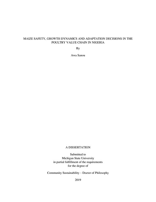 "Many countries in the global South have been experiencing a rapid transformation of their food systems in the last two decades. Nigeria, sub-Saharan Africa's most populous country and largest economy, has seen a rapid growth in poultry production as a result of rising incomes, urbanization, and increased demand for animal proteins. Despite this extraordinary performance, poultry businesses face several challenges. First, the poultry sector is characterized by a multitude of farm sizes, but little is known about the performance of each type or the processes that support their growth and modernization across space and time. Second, concerns related to higher temperatures linked to climate change are raising questions about the ability of poultry farms to protect their investments in order to maintain their current growth trajectories. Third, there is limited enforcement of food safety regulations in the country and no market mechanisms to regulate food safety challenges associated with maize, a key ingredient in poultry feed. The considerable presence of aflatoxins, deadly toxins produced by fungi, in domestically produced maize is therefore a major concern among poultry farmers due to its negative effects on the birds. This dissertation therefore 1) examines the structure of growth patterns in the poultry sector, 2) investigates the adaptation practices of poultry farmers to higher temperature, and 3) explores a market-based solution to supply aflatoxin-safe maize on the Nigerian market. Using a multi-method approach, it draws from both quantitative and qualitative data collected in states that play a major role in the poultry value chain in Southern and Northern Nigeria. The first essay uses the concept of minimum investment threshold, to investigate the dynamics of poultry farm sizes and its implication on the likely ability of farms to grow and withstand input price shocks. The second essay draws on a case study approach to examine poultry farmers' perceptions of higher temperatures, their effects on production and their adaptation strategies. The third essay uses a discrete choice experiment method to estimate maize traders' willingness to pay for aflatoxin-safe maize, a key quality attribute of the commodity. The findings of this dissertation have both policy and practical implications for actors involved in the Nigerian poultry value chain. First, it provides evidence of multiple equilibria (low equilibrium and high equilibrium) in the poultry industry in Nigeria and the existence of a critical minimum investment threshold to operate a farm at or around the high equilibria. Moreover, firms at (or headed towards) the low equilibria are less likely to experience growth and more likely to exit the sector in the event of an input price shock. Second, this work highlights that poultry farmers clearly perceive that temperatures are increasing, and they are adopting adaptation practices suitable to the size of their farms. Lastly, it provides suggestive evidence that a market-based solution that incentivizes maize traders to supply aflatoxin-safe maize is attainable as long as the buyers of the commodity care enough to pay a price premium for that attribute."--Pages ii-iii.