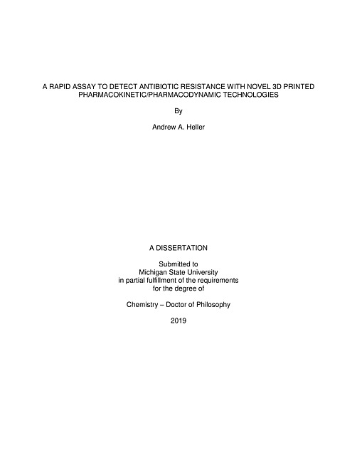 "The over-prescription and misuse of antibiotics has led some bacterial strains to become resistant to one, multiple, or all currently available antibiotics. In order to treat an antibiotic resistant bacterial infection, a novel antibiotic or therapeutic is required. Up until the last few years, there had been a trend of fewer new antibiotics due to pharmaceutical companies not pursuing antibiotic development. The continuous threat of antibiotic resistance and the lack of antibiotic research led to the National Action Plan, which called for novel, rapid diagnostic tools and new therapeutics to combat antibiotic resistance. The main reason for the lack of interest in antibiotic development is that drug development now cost a pharmaceutical greater than $2.5 billion and can take over 10 years. In addition, only 10.4% of drugs that enter clinical trials eventually are approved. One of the main causes of this low success rate is that the drugs do not have the same pharmacokinetics (PK) or pharmacodynamics (PD) as the drugs did in in vitro and in vivo animal models. These differences in PK/PD can lead to safety and efficacy concerns in humans. In this dissertation, this issue is combated with new technologies for antibiotic resistance identification. A rapid, static susceptibility assay was created in order monitor the growth of a bacterial culture by measuring the extracellular ATP/OD600, which in a healthy culture should increase to a maximum during early logarithmic growth phase and then decrease. Adding an antibiotic to a growing culture after this ATP/OD600 maximum led to an increase in the ATP/OD600, while a healthy culture decreased leading a statistical difference (alpha = 0.05) in 20--60 minutes after adding the antibiotic. This increase in the ATP/OD600 was due to the antibiotic's ability to effectively kill the bacteria by lysing leading to the OD600 remaining stable and extracellular ATP levels to increase. This trend was not seen when an antibiotic that the bacteria were resistant to was added. This procedure could also determine which antibiotic is killing the most bacteria in a mixed bacterial culture. The above procedure was adapted to be dynamic in order to expose the bacteria to a PK curve similar to that seen in a human so more clinically-relevant PD data could be measured. This was achieved by creating a fluidic, two compartment model that was 3D printed, which utilized porous membrane inserts that were created by novel 3D printed procedures to incorporate the membranes into the 3D printing structure. The device was characterized using fluorescein (332.31 g/mol) due to having similar properties to the antibiotic, levofloxacin (361.37 g/mol). The devices were impervious to leaking and were successful in replicating PK curves for an oral, intermittent intravenous (IV), and continuous IV administration. Replacing the fluorescein solution with a levofloxacin solution in growth media, bacteria were able to be exposed to an oral levofloxacin PK curve (C max = 12.4 +/- 3.0 microM; tmax = 1 hour; half-life = 5.2 +/- 0.5 hours). A kanamycin-resistant strain of Escherichia coli was determined to have a statistical difference in the ATP/OD600 when exposed to a levofloxacin concentration of 3.5 +/- 1.3 microM in the secondary compartment while a chloramphenicol-resistant strain of Bacillus subtilis showed a statistical difference at a concentration of 4.8 +/- 1.8 microM."--Pages ii-iii.