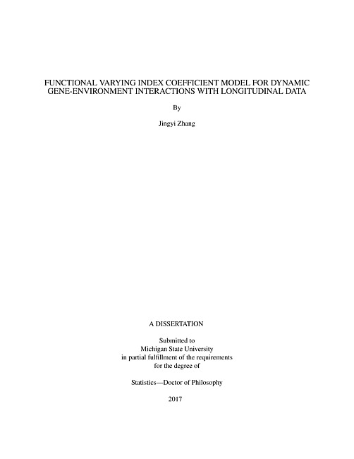 Rooted in genetics, human complex diseases are largely influenced by environmental factors. Existing literature has shown the power of integrative gene-environment interaction analysis by considering the joint effect of environmental mixtures on disease risk. Motivated by that, we propose a functional varying index coefficient model for longitudinal measurements of a phenotypic trait and multiple environmental variables, and assess how the genetic effects on a longitudinal disease trait are nonlinearly modified by a mixture of environmental influences. We derive an estimation procedure for the nonparametric functional varying index coefficients under the quadratic inference functions and penalized splines framework. Theoretical results such as estimation consistency and asymptotic normality of the estimates are established. In addition, we propose a hypothesis testing procedure to assess the significance of the nonparametric index coefficient function. We evaluate the performance of our estimation and testing procedure through Monte Carlo simulation studies. The proposed method is illustrated by applying to a real data set from a pain sensitivity study in which SNP effects are nonlinearly modulated by the combination of dosage levels and other environmental variables to affect blood pressure and heart rate of patients. In order to deal with discrete measurements for risk of disease, we further extend our proposed FVICM to a generalized varying index coefficient model (gFVICM) to binary longitudinal traits. We apply penalized splines to approximate the nonparametric varying index coefficients and develop an estimation procedure based on the quadratic inference functions. The asymptotic normality established in the theoretical results enables us to develop a model selection criteria and construct a test statistic based on the quadratic inference function. In hypothesis test, we investigate the linearity of GE interactions using the proposed testing procedure. The utility of the method is further demonstrated through a pain sensitivity case study in which SNP effects are nonlinearly modulated by the combination of environmental mixtures to affect high blood pressure.Genetic pleiotropy refers to the situation in which a single gene influences multiple traits and so it is considered as a major factor that underlies genetic correlation among traits. For some complex diseases, there are multiple phenotypes that can used to diagnose or to quantify the risk of diseases and usually they have shared genetic determinations. In multivariate longitudinal data, multiple response variables are jointly measured over time from the same individual. It is appropriate to take into account the correlation between multivariate longitudinal responses. Therefore, we propose the joint partially linear varying coefficient models and the testing framework to jointly test the association of genetic factors with bivariate phenotypic values adjusting for environmental factors. We extended the quadratic inference functions to deal with the longitudinal correlations and used penalized splines for the approximation of nonparametric coefficients. The proposed method is illustrated by applying to a real data set from a pain sensitivity study, in which systolic blood pressure (SBP) and diastolic blood pressure (DBP) were correlated longitudinal quantified phenotypes of SNP effects.