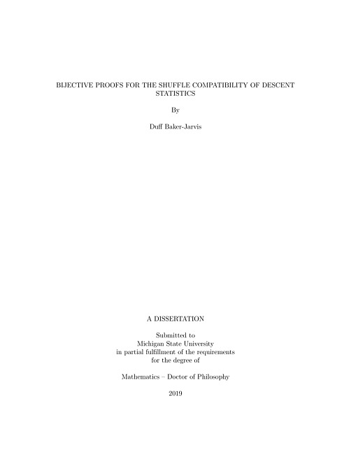 "Define a permutation to be any sequence of distinct positive integers. Given two permutations pi and sigma on disjoint underlying sets, we denote by pi shuffle sigma the set of shuffles of pi and sigma, that is, the set of all permutations obtained by interleaving the two permutations. A permutation statistic is a function, St, whose domain is the set of permutations and has the property that St(pi) only depends on the relative order of the elements of pi. A permutation statistic is shuffle compatible if the distribution of St on pi shuffle sigma depends only on the lengths of pi and sigma and St(pi) and St(sigma) rather than on the individual permutations themselves. This notion is implicit in the work of Stanley when he developed his theory of P-partitions, where P is a partially ordered set. The definition was explicitly given by Gessel and Zhuang who proved that various permutation statistics were shuffle compatible using mainly algebraic means. This work was continued by Grinberg. The purpose of the present work is to use bijective techniques to give demonstrations of shuffle compatibility. In particular, we show how a large number of permutation statistics can be shown to be shuffle compatible using a few simple bijections. Our approach also leads to a method for constructing such bijective proofs rather than having to treat each one in an ad hoc manner. Finally, we are able to prove a conjecture of Gessel and Zhuang about the shuffle compatibility of a certain statistic."--Page ii.