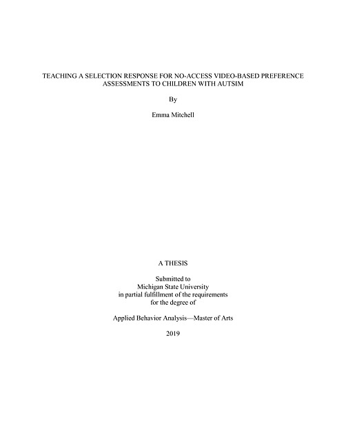 "This study examined the prerequisite skills necessary to conduct a no-access video-based preference assessment for two children with Autism Spectrum Disorder (ASD) who did not demonstrate a selection response during a video-based preference assessment. A brief Multiple Stimulus Without Replacement (MSWO) of videos of toys was used to teach a selection response by systematically fading the participants' access to toys during the preference assessment. Once the selection response was successfully taught with the toys, it was assessed with videos of social interactions. A progressive ratio (PR) schedule and concurrent operant reinforcer assessment were then conducted to determine the reinforcing effectiveness of the highest and lowest preferred social interactions from a brief MSWO for each of the participants. The selection response was successfully taught to both participants and mixed results were found from both reinforcer assessments for both participants."--Page ii.