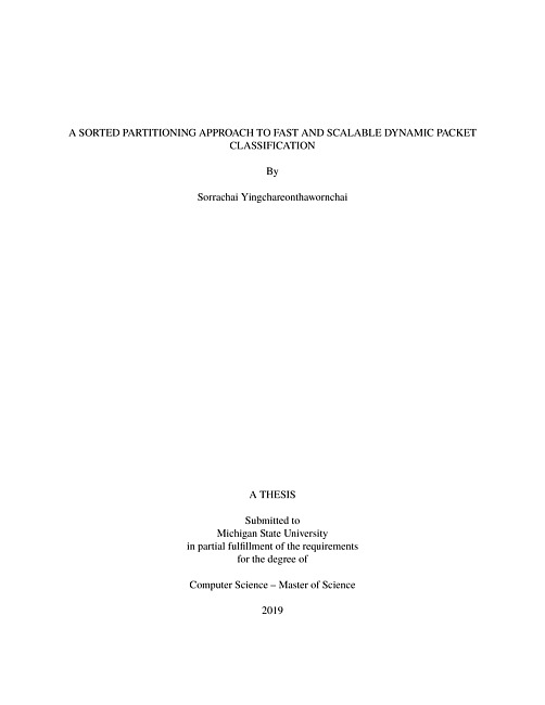 "The advent of Software-Defined Networking (SDN) leads to two key challenges for packet classification on the dramatically increased dynamism and dimensionality. Although packet classification is a well-studied problem, no existing solution satisfies these new requirements without sacrificing classification speed. Decision tree methods, such as HyperCuts, EffiCuts, and SmartSplit can achieve high-speed packet classification, but support neither fast updates nor high dimensionality. The Tuple Space Search (TSS) algorithm used in Open vSwitch achieves fast updates and high dimensionality but not high-speed packet classification. We propose a hybrid approach, PartitionSort, that combines the benefits of both TSS and decision trees achieving high-speed packet classification, fast updates and high dimensionality. A key to PartitionSort is a novel notion of ruleset sortability that provides two key benefits. First, it results in far fewer partitions than TSS. Second, it allows the use of Multi-dimensional Interval Trees to achieve logarithmic classification and update time for each sortable ruleset partition. Our extensive experimental results show that PartitionSort is an order of magnitude faster than TSS in classifying packets while achieving comparable update time. PartitionSort is a few orders of magnitude faster in construction time than SmartSplit, a state-of-the-art decision tree classifier, while achieving a competitive classification time. Finally, PartitionSort is scalable to an arbitrary number of fields and requires only linear space."-Page ii.