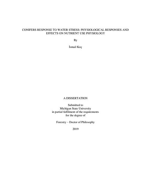 "Conifer species are the most extensively distributed on earth, and they are one of the most significant renewable resources with high economic value. Conifer species, Pinus and Abies species have been gaining popularity due to their desirable green color for products such as Christmas trees and are extensively used in landscaping. Not only inhabiting forest in their natural habitat, but also in plantations and reforestation areas usually outside their natural range where they have been exposed to water stress due to water shortage and the effects of climate change. Water stress is an important environmental factor for tree growth and development in plants. Therefore, we investigated the effect of irrigation and fertilization on balsam (Abies balsamae) and concolor fir (Abies concolor) and white pine (Pinus strobus ) seedlings in terms of tree morphology and physiology using a factorial design with three species and irrigation levels and two fertilization rates. Increased irrigation not only increased morphological traits such as diameter and height growth but also increased the net photosynthesis and stomatal conductance. The combination of each treatments had 5 seedlings for fir species and 4 seedlings for the pine species totaling 168 individual trees. White pine and balsam fir showed some drought tolerant mechanisms where concolor fir exhibited drought avoidance mechanisms. Fir species had higher net photosynthesis, stomatal conductance, transpiration rate and a lower water use efficiency compared to white pine. White pine had lower potassium concentration compared to two fir species, and balsam fir had higher calcium concentration compared to white pine and concolor fir under stress conditions, implying that fir species are more susceptible to water stress. We observed that concolor fir had a greater capacity for conserving water compared to white pine, leading to better above ground growth and shoot to root ratio. Balsam and concolor fir also had a greater foliar nitrogen concentration compared to white pine seedlings due to using an avoidance mechanism and maintaining nutrient uptake under water deficit conditions. White pine trees use drought tolerance strategies to reduce transpiration and maximize water uptake with increased root systems. White pine trees had higher below-ground biomass, with increased fine and coarse roots, and a lower nutrient use efficiency compared to two fir species. Moreover, we also tested the provenance and altitudinal variation of Turkish fir seedlings under water stress conditions. Morphological traits, such as relative root collar diameter, relative height growth, and stem volume index differed with seed source altitude as transplants from higher seed sources altitudes had greater growth compared to seedlings from lower altitudes. Overall, provenance had little effect on physiological parameters such as net photosynthesis, stomatal conductance, transpiration rate, internal CO2/ambient CO2 ratio, water use efficiency (WUE= A/E) and intrinsic water use efficiency (WUEi = A/gs), chlorophyll fluorescence (Fv/Fm) and carbon isotope discrimination rate (Delta13C). Provenances varied in stem water potential and net photosynthesis. Seedlings from the Karabuk provenances had high stem water potential and net photosynthesis. Intrinsic water use increased with altitude of the seed sources as seedlings from higher altitudes showed higher values compared to lower altitudes. Karabuk provenances might be more sensitive to water availability than Adapazari provenances. Adapazari provenances should be selected for the plantation and afforestation areas and production of Christmas trees."--Pages ii-iii.