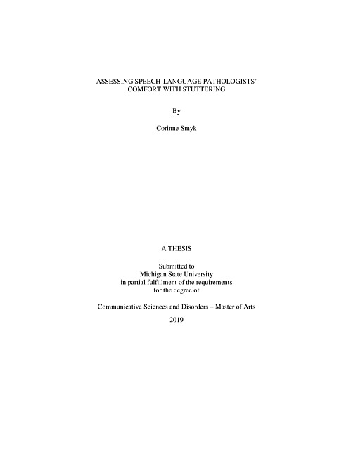 "There are approximately 3 million individuals in the United States who stutter; however, according to previous research, speech-language pathologists generally have lower levels of comfort and more negative attitudes regarding working with individuals who stutter. Although it is generally known that this population is not favored by speech-language pathologists, there has been a lack of research aimed at understanding why speech-language pathologists have these lower comfort levels and more negative attitudes. In the current study, the researchers interviewed speech-language pathologists across Michigan and gathered their input regarding working with students who stutter. The results indicate that there is a wide range in comfort levels and attitudes working with this population, based on a variety of correlating factors."--Page ii.