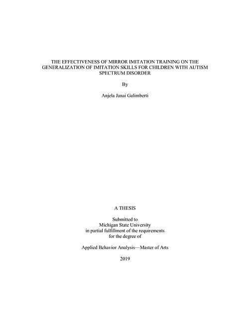 "The ability to imitate is a foundational skill related to multiple aspects of social, play, and language development in children. However, many children with autism spectrum disorder (ASD) do not imitate as effectively as their typically developing peers and therefore need direct instruction to acquire imitative repertoires. The current study investigated the effectiveness of Mirror Imitation Training: a relatively novel instructional procedure which uses a mirror as a tool to teach imitation skills. Three children with autism spectrum disorder who did not demonstrate a generalized imitation repertoire despite exposure to conventional imitation training methods were selected for participation. For all three participants, mirror imitation training was effective at producing skill acquisition across two sets of imitation targets and increased responding to the remaining untrained sets of imitation targets. Supplemental findings also showed 2 of the 3 participants required fewer sessions to criteria on set 2 after meeting criterion for their set 1 with MIT. These findings identify mirror imitation training as a promising teaching method to promote generalized imitation skills in children with ASD who do not demonstrate generalized imitation skills when taught with more traditional methods of imitation instruction."--Page ii.
