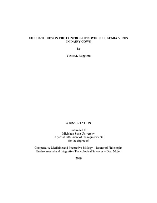 "Bovine leukemia virus (BLV) is an oncogenic deltaretrovirus of cattle that is estimated to infect more than 40% of U.S. dairy cows and cost the dairy industry hundreds of millions of dollars per year. BLV inserts a DNA copy (provirus) into the host genome and can cause leukemia and lymphoma in 1-5% of infected animals, while around 30% develop a non-malignant lymphocytosis, often coupled with high proviral load. BLV infection in dairy cows has also been associated with a number of economically important effects, such as decreased milk production, longevity, and immune function. The primary goal of this dissertation was to develop management protocols that can be implemented on U.S. dairy operations. We also aimed to further characterize in vivo immunologic effects of BLV infection, especially at mucosal junctions, hypothesizing that BLV+ cows would have lower concentrations of IgA antibody. To test the effect of BLV infection on total IgA concentrations, we analyzed the milk, saliva, and serum of BLV+ cows with varying lymphocyte count and proviral load profiles for comparison with BLV- herd mates. We found that BLV+ cows exhibited numerically lower concentrations of IgA in both milk and saliva, but not serum, in comparison to BLV- cows. Although the observed decreases were not statistically significant, the biological effects remain unknown. We also observed that the lowest concentrations of IgA were seen in the milk and saliva of BLV+ cows without lymphocytosis or high PVL, and these differences were trending toward significance. Our data, if confirmed, suggests that BLV may be disruptive to the immunology of mucosal junctions. We developed and implemented three field trials to evaluate management protocols for control of BLV in dairy herds. The first trial investigated the frequently suggested management intervention of improved medical hygiene by changing from shared needles and reproductive sleeves to single-use items. In this field trial, BLV- herd mates were assigned to control (re-use) or intervention (single-use) groups and the incidence risk was calculated semi-annually. Although we saw no difference in the risk of new infections in our study, medical hygiene may still play a role in the transmission of BLV as well as other diseases. This study also identified an increase in incidence risk in the summer exposure period. Meanwhile, our second field trial was a novel intervention which used milk ELISA screening to identify BLV+ cows for further characterization of their lymphocyte count (LC) and proviral load (PVL). In this manner, we identified cows thought to be the most infectious to their susceptible herd mates, and worked with herd managers to create a priority removal plan to consider when culling cows or implementing segregation measures. Overall, the three enrolled herds significantly reduced both BLV prevalence and incidence risk over a 2 to 2.5 year period. In this study, no significant associations with season were observed. Our final field trial aimed to demonstrate that milk ELISA testing could be used in herds with low BLV prevalence in order to identify and remove the few remaining BLV+ animals and achieve eradication of the virus. Two herds that were able to remove all BLV+ adult cows were generally successful, though the young stock (first lactation heifers) were a reservoir for reintroduction. In addition, we observed 5 first lactation heifers in one herd which had previously tested negative on serum ELISA but later tested positive on milk ELISA after entering the milking herd. This agrees with reports of latent BLV infections, and provides further evidence that long-term surveillance and further research on the infection dynamics of BLV are needed."--Pages ii-iii.
