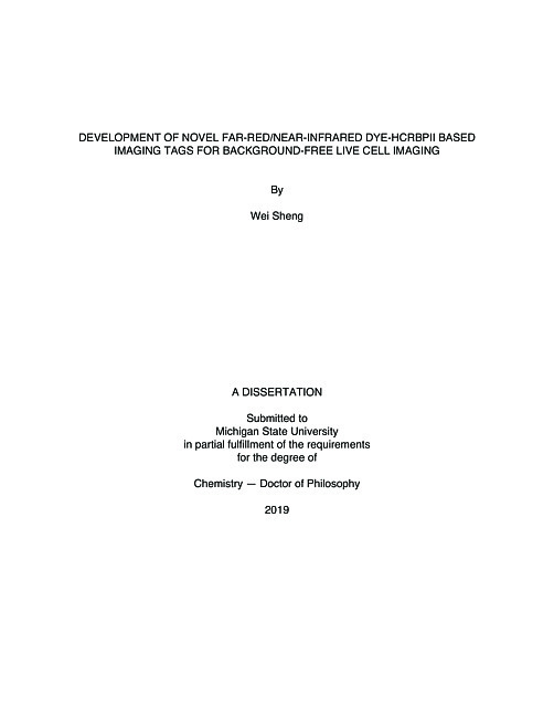 "Modern fluorescence imaging technologies, including deep-tissue imaging and super-resolution microscopies, require novel fluorescent labeling tags possessing non-conventional optical features, among which most desired ones are high brightness in the far-red/near-infrared (NIR) region and turn-on/off control in a spatiotemporal manner. Previously, we demonstrated the ability of fine tuning the absorption spectra of a protein-bound natural chromophore over an unprecedented range (474 6030364 nm). The goal of this PhD research is to exploit protein-ligand interactions for the development of protein-based pigments as NIR fluorescent tags for background-free live cell imaging. In the past half century, tremendous efforts have been invested in the optimization and derivatization of GFP-like fluorescent proteins (FPs). More recently, growing attention on phytochrome-based FPs has even upsized the repertoire of available FPs with many enhanced optical features. Giving this advancement, certain pitfalls are still limiting their uses in modern fluorescence imaging. In this context, synthetic dyes provide a broader chemical space for tailoring desired optic features including spectral wavelengths, brightness, stability, and many more photophysical and/or photochemical functionalities. To achieve high contrast imaging with minimal background interference, three different strategies have been applied here. 1) NIR emission is approached by utilizing a dye capable of specific complexation with a target protein via imine bond formation. Upon protonation of the imine, the complex experiences a large bathochromic shift as a result of a strong intramolecular charge transfer (ICT) process. A light-triggered imine isomerization is further incorporated to furnish a photoswitchable tag and negate the routine wash steps in live cell experiments. Rational protein engineering affords a faster variant that allows unprecedented spatiotemporal control of this no-wash bright NIR imaging. (2) A rare organic super photobase is identified, exhibiting a 14-unit change in pKa upon light excitation. Steady-state and ultrafast spectroscopic measurements ascribe this event to an excited-state proton transfer (ESPT) process. This ESPT feature is recapitulated in a protein-ligand micro-environment, yielding protein-dye complexes with extremely high fluorescence quantum yields (up to 92%) and large pseudo-Stokes shifts (> 200 nm). Our optimal mutant bound to the dye boasts millisecond binding rate and enables live cell imaging with negligible background. (3) A general approach to fluorogenicity, i.e., the ability to turn on fluorescence, is designed by coupling a quenching moiety capable of photoinduced electron transfer (PeT) to our dyes. The fluorescence is negligible before the Michael addition of engineered cysteine residue (the trigger) with the quencher moiety. A 30-fold fluorescence enhancement is achieved in vitro with an electronically tuned quencher group. Currently, further modifications are in progress to optimize the quenched system for in vivo applications."--Pages ii-iii.