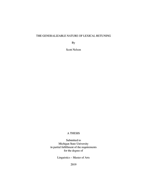 "Auditory speech identification has been observed to be influenced by both lexical and visual information. Perceptual learning experiments have used two unique paradigms to test how each of these information sources affects the identification of ambiguous stimuli. In both cases, listeners are more likely to identify ambiguous stimuli in the direction of the disambiguating information they receive. It has been further argued that the resulting effects are the same and can be traced back to the same general speech perception mechanism. Despite this claim, there have been conflicting results in regards to generalization. Lexically induced perceptual learning has been observed to generalize to new contexts, while visually induced perceptual learning has been observed to be context dependent. While the difference in these observed results could be explained by the information source (lexical vs. visual), there are also crucial differences in the experimental designs that may offer a better account. The training stimuli set for lexically induced perceptual learning experiments includes many unique tokens that are presented one time each. For visually induced perceptual learning experiments, the training set includes just one unique token presented multiple times. Listeners therefore only receive type variation in the lexically induced perceptual learning experiments. Crucially, type variation has been observed to be necessary for learning linguistic patterns and therefore may explain the differences in observed results between the two paradigms. This current study uses three new experiments to study the generalizable nature of lexically induced perceptual learning. The results corroborate the idea that generalization of the effect to new contexts is possible in lexically induced perceptual learning experiments when listeners are trained with type variation, but when type variation is eliminated the ability to generalize the effect to new contexts is no longer observed."--Page ii.