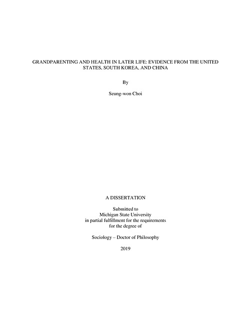 "A significant increase in life expectancy over the past decades has changed intergenerational relationships and the role of older adults in aging families. Increasingly, older adults have been involved in caring for grandchildren (i.e., grandparenting), a role emerging in later life. In light of the role strain/enhancement theories, this dissertation investigates how grandparenting is related to the physical and mental health of older adults, and how this association varies by sociocultural context. I adopt a three-essay format to address this research question. My first study draws from the Health and Retirement Study (1988-2014) to examine the linkage between grandparenting and mortality risk, and its racial/ethnic variation in the U.S. The results from the event history models reveal different racial/ethnic patterns in the effects of grandparenting on mortality risk. The mortality advantage of providing grandparenting is robust for white grandparents, whereas the mortality disadvantage of grandparenting is mainly found among black grandparents. In the second study, I investigate how grandparenting affects depressive symptoms among older women in South Korea, using the Korean Longitudinal Study of Aging (2008-2012). The results from growth curve models indicate that caregiving grandmothers in multigenerational households experience a decline in depressive symptoms over time. The mental health gap between the multigenerational household grandparenting and non-caregiving groups decreases with age and reverses after age reaches the mid-60s. Drawing from the China Health and Retirement Longitudinal Study (2011-2015), the third study uses growth curve models to assess how grandparenting influences depressive symptoms in China. The analyses show that the level of depressive symptoms increases over time among older adults who reside in rural regions and provide multigenerational household grandparenting. The provision of full-time noncoresident grandparenting has an initially protective effect on the depressive symptoms among rural older adults. However, socioeconomic status partially accounts for the association between grandparenting and depressive symptoms. Taken together, the findings of this dissertation confirm that grandparenting plays a significant role in physical and mental health in later life. The effects of grandparenting on health and the underlying mechanisms which explain these relationships vary by sociocultural context. My dissertation advances our knowledge about intergenerational relationships by examining racial/ethnic and social/cultural differences in the consequence of grandparenting for health and well-being in later life."--Pages ii-iii.