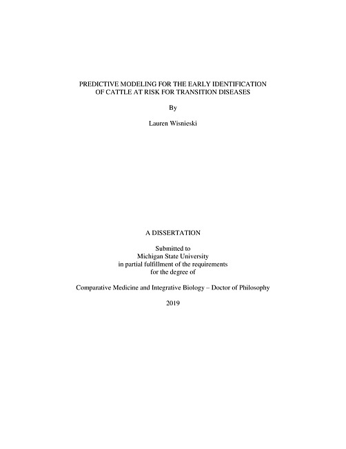 "The transition period is defined as the time that spans approximately 3 weeks before to 3 weeks post-partum. During the transition period, dairy cattle experience tremendous physiological changes that occur to prepare for milk production. Cows that transition poorly undergo excessive metabolic stress, which increases the risk for disease. Metabolic stress is a physiological state composed of 3 components: inflammation, oxidative stress, and nutrient metabolism. Cows undergoing metabolic stress are typically identified by measuring biomarkers, monitoring feed intake, and reviewing health records. The biomarkers that are typically used to monitor metabolic stress are non-esterified fatty acids (NEFA) and beta-hydroxybutryrate (BHB), which are nutrient metabolism biomarkers. Although NEFA and BHB are effective for identifying cows undergoing metabolic stress, they are measured too close to calving to make proactive changes in management to reduce disease incidence in the current calving cohort. Therefore, our objective was to build predictive models for transition cow diseases using all 3 components of metabolic stress at dry-off, which would allow more time to intervene with proactive interventions. To address this objective, we designed a prospective cohort study carried out on 5 Michigan herds (N = 277 cows). We randomly selected cows to form 18 calving cohorts, which were defined as cows at the same stage of lactation that were expected to calve at approximately the same time. We followed the cows until 30 days post-partum to monitor for disease occurrence. Disease was defined as an aggregate outcome where a cow was defined as positive if she was diagnosed with 1) one or more clinical transition disease outcome (mastitis, metritis, retained placenta, ketosis, lameness, pneumonia, milk fever, displaced abomasum) and/or 2) one or more adverse health events (i.e. abortion, death of calf or cow). Our first specific aim was to build individual cow-level models, which are presented in Chapter 2. We built separate model sets for each component of metabolic stress, and a model set that included all 3 components. We hypothesized that the combined model would be better able to predict transition cow diseases. Our hypothesis was supported and the area under the curve calculated from receiver operator curve curve analyses was significantly higher for the combined model compared to the separate model sets (P < 0.05). Our second specific aim was to build cohort-level models, which we addressed in Chapters 3 and 4. In Chapter 3, we tested ways to aggregate individual-level biomarker and covariate data to the cohort-level. We tested 3 different methods that we referred to as the "central," "dispersion," and "count" methods. We also tested combining all 3 methods for prediction. We hypothesized that these methods would be effective at aggregating data to the cohort level. We found that the central method, which aggregated data either by calculating the mean (for continuous variables) or the median (for categorical variables) of values within a cohort, was the only method that produced viable models. Chapter 4 tested if individual level predictive probabilities generated from models in Chapter 2 can be aggregated to predict disease incidence at the cohort-level. We tested 3 different methods to aggregate predicted probabilities which we referred to as the "p-central," "p-dispersion," and "p-count" methods, and we tested the efficacy of combining all 3 methods. We hypothesized that the models would produce valid disease estimates. We found that the p-dispersion method was the only method that produced viable models, which involved calculating the standard deviation of predicted probabilities within a cohort."--Pages ii-iii.