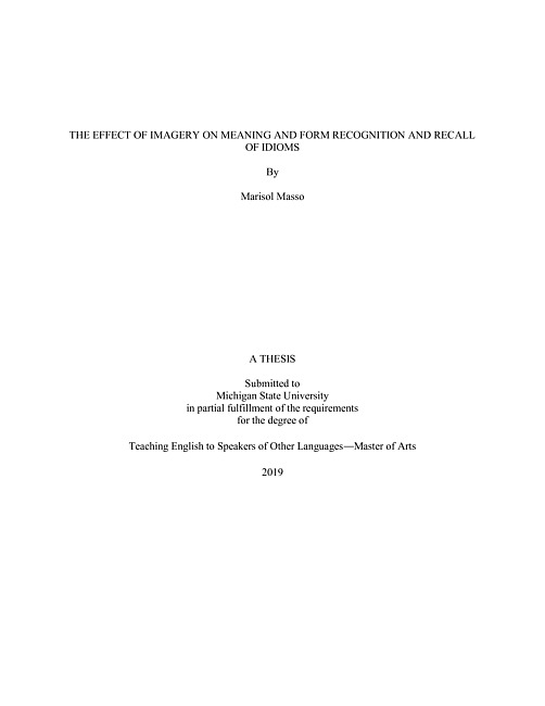 "This research project aims at investigating whether the use of imagery -- pictures and etymological notes -- has a facilitative effect on the recognition and recall of the form and meaning of American idioms. Spanish speakers (n = 71) enrolled in English programs in Argentina participated in a pretest, a learning phase activity, and an immediate post-test. One week later, participants (n = 39) took a delayed post-test in-person or online. All tests had the same format: a sentence completion task, a receptive form multiple-choice task, a definition task, and a receptive meaning multiple-choice task. Results indicate that all conditions -- including pictures, etymological notes, and the combination of both -- had no statistically significant differences between them, and thus, they all contributed to idiom learning. However, the data also shows a tendency for pictures to facilitate structural elaboration of idioms in the short-term while etymological notes seem to hinder it."--Page ii.