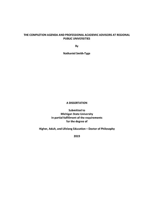 "This qualitative study explored the experiences of professional academic advisors at three broad access regional public universities as they worked in the policy environment of the completion agenda. Employing a narrative inquiry approach through single-session semi-structured interviews, I gathered the stories of the nine participants about their professional experiences. This dissertation includes an in-depth discussion of the state of the completion agenda when the study was conducted. The existing literature related to policy issues in higher education and academic advising is also presented. The study employs three theoretical frameworks to guide the analysis of the collected data. The first framework is the agency and structure theory as presented by Coburn et al. (2016). The second framework is based on the work of Cohen (1990) and is rooted in his foundational work on policy implementation from Mrs. Oublier's classroom. The final framework is the community of practice theory as presented by Coburn & Stein (2006). The key findings of this study are that the advisors lack agency in their professional roles and often times find themselves constrained by the structure and systems in their offices and universities. This manifests into three overarching themes that were found in the data. The first is that the participants are disconnected from the policy process at all levels. The frustration with this lack of agency leads to the second theme which is the advisors view themselves as student focused and not policy focused, which allows them to reclaim a level of professional agency. The third theme finds that often times the participants find themselves at odds with professional staff members in other departments on their campus that have different missions and purposes. Through the stories of the participants this study provides a context rich and empirical view of the experiences of academic advisors as they contend with the policy environment created by the completion agenda. The dissertation also provides implications for practice, research, theory, and policy. The key implication is the need for the involvement of advisors (and all student-facing professional staff) in the policy creation process at all levels. The advisors understand their work the best and should have a role in shaping the systems and structures that effect their ability to successfully work with students."--Pages ii-iii.