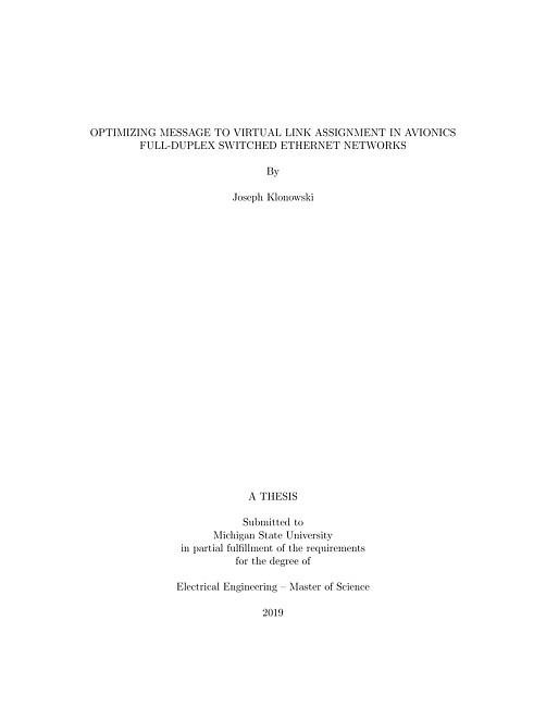 "Avionics Full-Duplex Switched Ethernet (AFDX) is an Ethernet-based data network that provides deterministic performance, high reliability, and lower costs and development time by utilizing commercial off-the-shelf networking components. As AFDX networks have become of the network are continually being evaluated. There are two main types of solutions to improving network performance: changes to the physical layer and changes to the logical layer. Because the physical network is setup prior to defining the data that is transferred on the network, logical layer optimization becomes important and is often the only viable solution. Previous research has explored optimization of different aspects of the logical solution for a given target (whether it be latency or bandwidth), however, an approach for a customizable target using optimization techniques has not been attempted. In this work, we provide an overview of AFDX networks and discuss factors engineers consider while optimizing the network. Previously researched solutions are evaluated for effectiveness. We identify the need for an optimization solution that allows for a customizable objective to account for both message latency and bandwidth. To fill this gap, we consider the problem of assigning messages to virtual links, which are configurable, logical unidirectional links from publishing end systems to one or more subscribing end systems. We propose a flexible framework based on particle swarm optimization (PSO) that performs message to virtual link assignment in AFDX networks to optimize a user-defined objective. We discuss and provide results on PSO optimization for a range of hyperparameters. Finally, results for a sample swarm are presented to prove the feasibility and usefulness of the proposed approach."--Page ii.