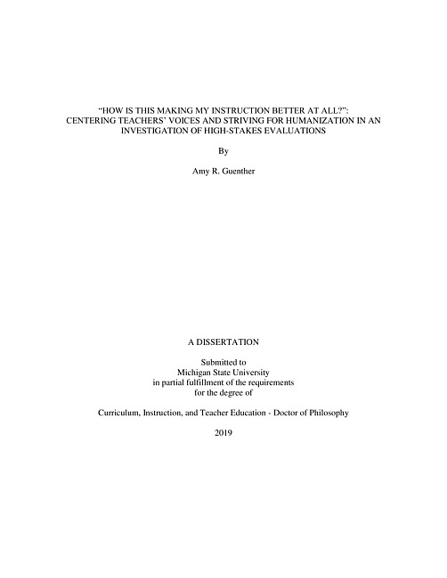 This dissertation investigates teachers’ perceptions of high-stakes evaluations and examines the methods used to conduct this research. While the evaluation of teacher performance has been a long-standing practice in the United States, recent education reform policies have placed a much greater emphasis on teacher evaluation (Cohen & Goldhaber, 2016). These neoliberal policies largely focus on assessing performance to hold teachers accountable (Papay, 2012) and have resulted in many states adopting performance-based teacher evaluation systems with high-stakes attached to them (Goldstein, 2014; Lavigne, 2014). These reforms have significantly changed both how teachers are evaluated and the implications of their evaluations. The purpose of this dissertation is to better understand the professional and personal consequences of these high-stakes evaluation systems on teachers, as well as how this research might be conducted in humanizing ways. Thus, I examine the lived experiences of teachers from three elementary schools in different suburban districts in Michigan, as well as aspects of humanizing research (Paris, 2011: Paris & Winn, 2014) that I incorporated into my research methods. This three article dissertation highlights the perspectives of teachers and reveals potential reasons for the ineffectiveness of high-stakes evaluation to improve practice, as well as several harmful consequences that high-stakes evaluations can have on teachers. At the very least, this current evaluation system does not encourage teachers to work together to improve their practice. At its most consequential, it appears to be encouraging isolationism and creating adversarial relationships among some teachers. Thus, I argue, by implicitly and explicitly discouraging collaboration, the current evaluation system is decreasing teachers’ access to the social capital that could help them be more effective in their practice. Additionally, while doing little to enhance their practice, these high-stakes evaluations are negatively influencing teachers’ identities. This finding is particularly significant when one considers teachers’ identities have been linked to their commitment, well-being, sense of agency, and effectiveness (Day & Kington, 2008). Therefore, I argue, it is doubtful that the current evaluation system, which focuses on accountability, is producing the desired effect of improved teaching and may actually be counterproductive, negatively influencing both teachers’ practice and their identities. I contend that teachers’ voices should inform necessary changes to teacher evaluation to produce evaluation systems that actually improve their practice and enhance their identities as teachers. Furthermore, in describing and reflecting upon my efforts to make my research more humanizing for my participants, this dissertation offers methods and a rationale for utilizing aspects of humanizing research amidst neoliberal policies. Such methods can implicate and counter the deprofessionalizing and dehumanizing effects of neoliberal policies on teachers.
