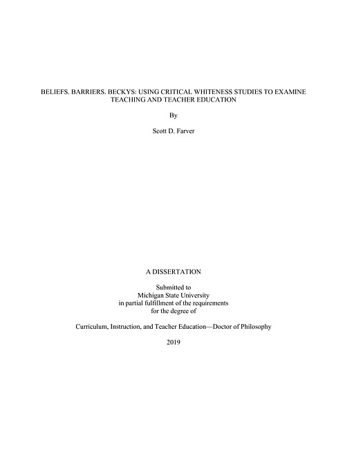 "This dissertation uses the theoretical framework of Critical Whiteness Studies (CWS) across three discrete articles to examine teaching and teacher education. CWS offers a mechanism to highlight and critique the ways Whiteness operates within teaching and teacher education. Across the pieces, I argue that Whiteness is both pervasive and shifting as it takes shape in many different forms to help maintain power. In the first article, I examine how a White, female elementary student teacher's beliefs about race emerge through her personal experiences, professional experiences, and in discussing her pedagogical choices. While I argue that Ms. B's beliefs about race are problematic, this article is really a story of missed opportunities. Despite the best of intentions on all of our parts, I will show how each of us---Ms. B, her teacher preparation program, and me as a researcher---had and missed chances to do better when it came to her racial beliefs. The second article follows Ms. B (who becomes Mrs. B) into her first year of teaching. The purpose of this article is to highlight the ways Whiteness prevents teachers like Mrs. B from engaging in the issue of race in meaningful ways. Findings demonstrate that Mrs. B attempts to teach about race in critical ways, but falls short. She also perceives barriers to teaching about race in critical ways, such as prohibitive district stances and a lack of time. In this article, we see the ways Whiteness is perpetuated throughout Mrs. B's practice through the uncritical ways she teaches about race and her inability to overcome the barriers she perceives as preventing her from doing this work. The final article is unique in that it is not an empirical study, but rather a fictionalization grounded in tenets of CWS that draw upon my own experiences working with "Beckys" within teacher education. This story is written in the form of a monologue that describes what happens when a teacher educator crosses a "Becky" (a White woman who weaponizes her racial identity) in their teaching---how Becky's visceral response to being confronting about her racist ideas results in tangible and negative consequences for the teacher educator. While I draw upon my own experiences to write this fictionalized monologue, it is purposefully written in a way that the reader could (hopefully) be able to identify with the protagonist as they struggle with the ramifications of confronting a Becky about race through the monologue. By using a shared framework of Critical Whiteness Studies across the three distinct pieces of this dissertation, I am able to interrogate the ways Whiteness operates in similar, yet different ways in both teaching and teacher education. Across the pieces, I argue that, without sustained and directed focus, Whiteness will continue to morph and maintain power, despite anyone's best intentions."--Pages ii-iii.