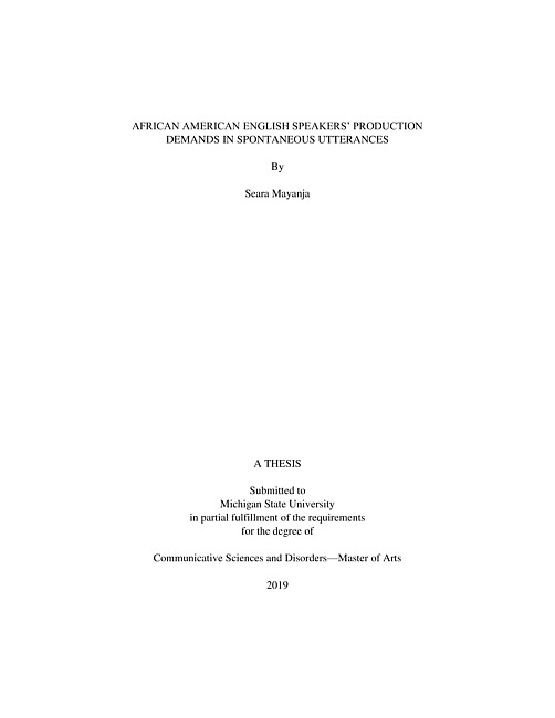 "African American English (AAE) dialect speakers have unique speech production demands regarding the environment and linguistic production. This study observes the acoustic impact of these variables and the relationship between the occurrence of select AAE phonological features and disfluency occurrences from 19 African American adults from the South and other regions of upbringing. Results of this study reveal a positive correlation between AAE dialect feature occurrences and disfluencies presented during a story retell task for participants from the Southern region. Additional findings revealed significance in the variation of AAE dialect feature use between female and male participants as well as participants from the Southern region. Clinical implications of this study show the need to observe naturalistic speech across environments and the need for better understanding of perceptual judgment and disfluency for AAE dialect speakers."--Page ii.