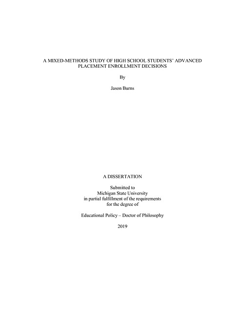 "The Advanced Placement (AP) program is often touted as an opportunity for academically talented high school students to be exposed to a rigorous, college-level classroom setting. Components of the AP program include a range of courses and corresponding standardized assessments. According to the College Board, which administers the AP program, students who take AP courses have an opportunity to gain advanced knowledge and skills, to improve the quality of their college applications, and earn college credits (College Board, 2017b). Based on this reputation, AP participation has increased dramatically in recent years. In the spring of 2017, over 2.7 million students took an Advanced Placement (AP) exam, a more than three-fold increase over the spring of 2001 (College Board, 2017a). While AP enrollment has expanded dramatically, AP participation varies significantly across student groups. Relative to White students, Hispanic students are approximately 25% less likely to participate in the AP program and Black students are just half as likely. Low-income students, compared to their non-economically disadvantaged peers, are over sixty percent less likely to be an AP student (Theokas & Saaris, 2013). These patterns have led to calls to increase AP participation, especially amongst students from disadvantaged groups. Some, however, have expressed concerns that expanding AP enrollment without considering students' ability may set some up for failure (Finn & Winkler, 2011). Because high school students typically have significant agency in the courses they take, I argue that understanding AP participation requires an understanding of students' decision-making around whether to take an AP course. In this dissertation, I investigate students' AP enrollment decisions by answering the following research questions: 1) What are the patterns in AP enrollment for the overall student population and for the sub-population of academically talented students?; 2) How do student characteristics vary by AP enrollment status?; 3) What student-level factors or characteristics predict enrollment in AP classes?; and 4) How do perceptions of AP classes and students vary across student groups? To answer these research questions, I use the conceptual frameworks of judgment and decision-making, social-emotional skills, and identity in a mixed-methods explanatory case study of two high schools in Michigan that includes student-level administrative data (n = 16,939 student-year observations), student surveys (n = 389), and student interviews (n = 19) in 2018. Results show: (1) disadvantaged students participate in AP at lower rates, but that the size of the participation gap is sensitive to how AP participation is defined, and that many academically talented students do not take an AP class; (2) students who enroll in AP classes are, compared to their peers, less diverse, higher-achieving, wealthier, have more developed social-emotional skills, a stronger academic identity, and make decisions more deliberatively; (3) achievement is the strongest and most reliable predictor of AP enrollment, though constructs related to identity, social-emotional skills, and decision-making tendencies also appear to be related to enrollment; and (4) students generally perceive AP classes as difficult and AP students as academically talented, students of color are acutely aware of the lack of diversity in AP classes, and some students link their course selections to their future. I interpret these findings using the conceptual frameworks employed in this study and develop a conceptual model of students' AP enrollment decisions. Implications for researchers, educators, and policymakers are discussed."--Pages ii-iii.