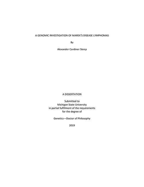 "Meq, a bZIP transcription factor and the viral oncogene for pathogenic strains of Marek's disease virus (MDV), is required to induce CD4 T cell lymphomas that characterize Marek's disease (MD) in chickens. However, Meq is not sufficient for neoplastic transformation as not all birds infected with pathogenic strains of MDV developed Marek's disease. We hypothesize that additional drivers or somatic mutations in the chicken genome are required for MDV-induced transformation. Using and integrating DNA and RNA genomic screens of Marek's disease tumors from genetically-defined experimental layers, our analyses reveal 0.3 somatic mutations per megabase consisting primarily of somatic single nucleotide variants (SNVs) and small insertions and deletions (Indels). Somatic deletions, insertions, and point mutations were enriched in IKZF1 (Ikaros), the first driver gene of Marek's disease lymphomas. Ikaros, a Zn-finger transcription factor and the master regulator of lymphocyte development, is a known tumor suppressor in human and murine acute leukemias and lymphomas. In our surveyed Marek's disease tumors, 41% of the samples had somatic mutations in key N-terminal Zn-finger binding domains, strongly suggesting perturbed Ikaros function in its ability to bind DNA and regulate transcription. Somatic mutations in IKZF1 were preferentially found in tumors of gonadal tissues as well as their metastatic clones. IKZF1 mutant Marek's disease tumors revealed gene expression profiles indicative of Ikaros perturbation. In addition to IKZF1, other putative somatic mutations reside in ZNF384, EFNA5, CLDND1, FOXD1, ROBO1, and ROBO2 and warrant evaluation. Our results suggest MDV-induced tumors are driven by both Meq expression and IKZF1 somatic mutations that in combination lead to unregulated proliferation, increased cell adhesion, increased migration, and dedifferentiation."--Pages ii-iii.