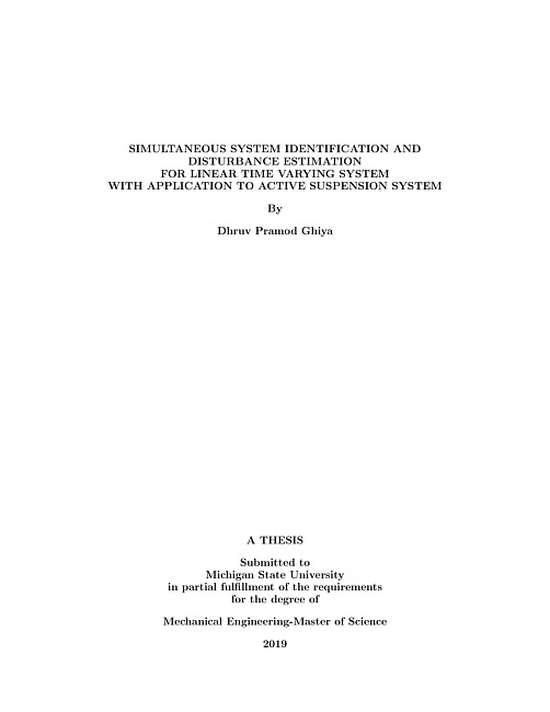 "Various control techniques have been developed in order to improve the suspension performance since late 20th century. Controllers have been developed to reject the road disturbance in case of time invariant suspension systems. Although some of these researches give good results for non-linear suspension systems with parameter uncertainties, there is not much research done which treats a time varying system. I propose here an approach based on output tracking state feedback controller with disturbance rejection for linear time varying system to tackle this problem in case of a quarter car suspension model. The proposed controller works even in case of completely unknown plants. This algorithm, combined with a pole placement controller, can be used to ensure ride comfort and to avoid damage to vehicle components. If a nominal model is known, it can also estimate time varying road disturbances which can be written as a summation of sinusoids and this estimate can be used as a preview to enhance the control performance of other vehicles. We compare the proposed algorithm with LQR tracking algorithm in simulation and superior performance is demonstrated. Bounds on the time varying parameters are derived in terms of norm of the states, within which the proposed algorithm is guaranteed to work."--Page ii.