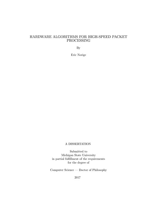 The networking industry is facing enormous challenges of scaling devices to support theexponential growth of internet traffic as well as increasing number of features being implemented inside the network. Algorithmic hardware improvements to networking componentshave largely been neglected due to the ease of leveraging increased clock frequency and compute power and the risks of implementing complex hardware designs. As clock frequencyslows its growth, algorithmic solutions become important to fill the gap between currentgeneration capability and next generation requirements. This paper presents algorithmicsolutions to networking problems in three domains: Deep Packet Inspection(DPI), firewall(and other) ruleset compression and non-cryptographic hashing. The improvements in DPIare two-pronged: first in the area of application-level protocol field extraction, which allowssecurity devices to precisely identify packet fields for targeted validity checks. By usingcounting automata, we achieve precise parsing of non-regular protocols with small, constantper-flow memory requirements, extracting at rates of up to 30gbps on real traffic in softwarewhile using only 112 bytes of state per flow. The second DPI improvement is on the longstanding regular expression matching problem, where we complete the HFA solution to theDFA state explosion problem with efficient construction algorithms and optimized memorylayout for hardware or software implementation. These methods construct automata toocomplex to be constructed by previous methods in seconds, while being capable of 29gbpsthroughput with an ASIC implementation. Firewall ruleset compression enables more firewall entries to be stored in a fixed capacity pattern matching engine, and can also be usedto reorganize a firewall specification for higher performance software matching. A novelrecursive structure called TUF is given to unify the best known solutions to this problemand suggest future avenues of attack. These algorithms, with little tuning, achieve a 13.7%improvement in compression on large, real-life classifiers, and can achieve the same results asexisting algorithms while running 20 times faster. Finally, non-cryptographic hash functionscan be used for anything from hash tables to track network flows to packet sampling fortraffic characterization. We give a novel approach to generating hardware hash functionsin between the extremes of expensive cryptographic hash functions and low quality linearhash functions. To evaluate these mid-range hash functions properly, we develop new evaluation methods to better distinguish non-cryptographic hash function quality. The hashfunctions described in this paper achieve low-latency, wide hashing with good avalanche anduniversality properties at a much lower cost than existing solutions.