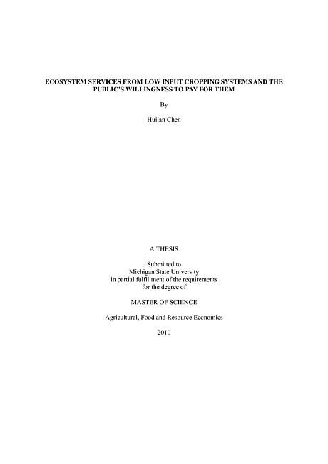 This thesis intends to value off farm ecosystem services from low input cropping systems by estimating the public's willingness to pay for them. Chapter one summaries what kinds of off farm ecosystem services will increase by adopting low input cropping systems and how much they will increase. It quantifies field experiment results on ecosystem services at the state level under widespread adoption of low input cropping systems and identifies a set of ecosystem service increases that are thought to significantly affect the general public. Five ecosystem service changes including reductions in drain dredging, flood damage, high nitrate drinking water wells, eutrophic lakes, and greenhouse gas emission were identified as having a significant impact on the general public. Chapter one lays the scientific base for the services valued in chapter two. Chapter two focuses on the economic valuation of ecosystem service changes. Two ecosystem service changes, eutrophic lakes reduction and greenhouse gas emission reduction are selected. The contingent valuation survey is applied. A mail survey was sent to 6000 randomly selected Michigan residents. Results show that Michigan residents are willing to pay for a decrease in eutrophic lakes, but only the 40% who are concerned about global warming are willing to pay for a decrease in greenhouse gas emission. Another finding is that people's probability of having zero willingness to pay is endogenous. It is sensitive to the scope of ecosystem service changes and some demographic variables such as household income and attitudes towards global warming. The implication is that studies that do not allow the share of people with zero willingness to pay to adjust to the magnitude of ecosystem service changes will undervalue increases in ecosystem services.