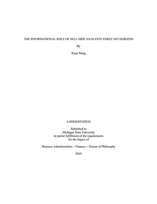 This dissertation explores the informational role of sell-side analysts' change in forecasting horizon. I find that portfolios formed by buying stocks with large increase in analyst horizon and shorting stocks with large decrease in analyst horizon generate superior future return. Horizon change has information incremental to analyst earnings forecast and recommendation revisions, as well as firm fundamentals. Large increase in horizon mainly drives the result. I find that analysts who contribute to strong horizon increase are associated with higher forecast accuracy. This increase is likely associated with the career concerns of inexperienced analysts. The return predictability associated with analyst forecast horizon change exists in the information environment of high liquidity and low volatility, at the times when analyst forecasts are the most accurate. Moreover, analyst forecast horizon is partially related to analysts' profitability prediction and firm risk assessment, although the horizon change, the component predictable by firm fundamentals notwithstanding, is still able to predict return in the short-run. Overall, the findings reported in this dissertation support the view that sell-side analysts are important rational-information providers in the financial industry.
