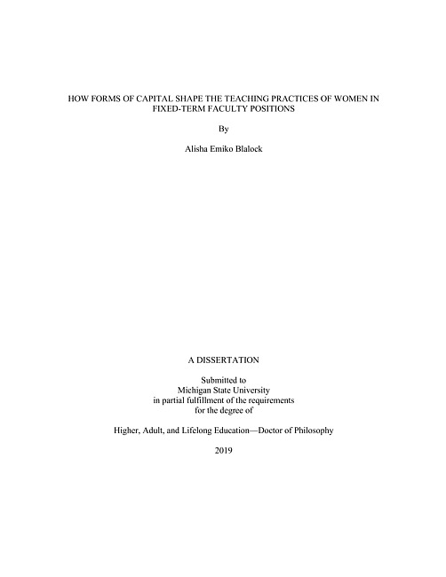 This critical narrative study illuminates the teaching practices of women in fixed-term faculty positions. While a groundswell of research has been presented on fixed-term or non-tenure track faculty, very few provide in-depth descriptions of their teaching as it is shaped by their experiences in graduate school. I drew from the theoretical work of Bourdieu to highlight how access to and accrual of social, economic, and cultural capital informed future careers and workplace performance for women in fixed-term position. From the narratives of 16 women at a comprehensive university in the Midwest, I described 1) two pathways into and through graduate school and 2) three archetypes to describe their teaching practices. Findings from this study suggested having a spouse and/or communities ties created a sense of stability for the women in my study, thereby giving them greater agency in the classroom. These findings draw attention to the important ways personal lives, or lives lived outside academia, shape the teaching work of faculty in fixed-term positions. Furthermore, my findings draw attention to how the fixed-term or non-tenure track faculty is stratified within itself, and this stratification is ordered through the institution of marriage or ties to local community.
