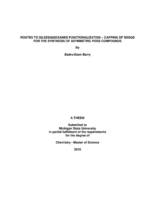Polyhedral oligomeric silsesquioxanes (POSS) have been explored for over 7 decades. These organic/inorganic nanostructures are extremely versatile compounds that are compartible with polymer systems, hence making them ideal components for the synthesis of next generation hybrid materials. Their properties may vary based on the organic peripheral unit, but they are generally environmentally friendly, cheap, easy to process, highly soluble in organic solvents, and exhibit high thermal degradation temperatures, low dielectric constant and high degree of hardness as coating agents. These features of silsesquioxanes have led to a growing interest in the exploration of their chemistry, particularly on their synthesis and applications in polymer synthesis, catalysis, biomedical materials, and electronics. Cubic silsesquioxanes and their double decker (DDSQ) counterparts have been the most useful because these compounds possess the architecture that accommodates functionalization. However, most of the progress recorded to date has been limited to either manipulations on the closed cubic structures or use of double deckers to synthesize functionally symmetric POSS compound. These compounds do display the desired physicochemical properties, but their applications pose the challenge of tethering them with two dissimilar polymeric chains.In this thesis, efforts have been made to develop a route for the selective synthesis of asymmetric POSS compounds that are likely to provide more resourceful applications to the polymer and material sciences. The research utilized the versatility of protecting groups to effect selective functionalization of the DDSQ for entry into the desired target. The asymmetric POSS cage has the potential to allow its dispersal into two dissimilar polymer matrices, generating a POSS/polymer composite that is unprecedented.