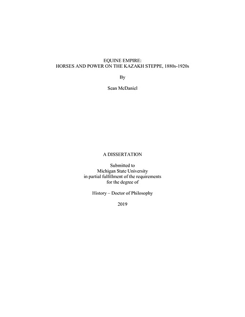 Located in the north of Kazakhstan and extending the entire width of the country, the Kazakh Steppe is a temperate grassland ideal for the mobile pastoralism Kazakhs had practiced for thousands of years prior to the Russian Empire's encroachment on the region. An occupation naturally inclined toward the use of horses, Kazakhs developed an economy, culture, and society in which ownership of and access to these animals played a central role. Their reverence for the horse, coupled with the suitability of the region toward horse breeding resulted in the Kazakh Steppe claiming the world's largest horse population by the end of the nineteenth century. However, their use of horses and understanding of the land differed fundamentally from that of the growing numbers of Slavic peasant settlers making their way to the region in the aftermath of Russian serf emancipation. The collision of these two societies and ecologies drastically altered the landscape of horse breeding in the steppe as well as Kazakh horse culture itself. During this same period, Russian authorities were witnessing a steep decline in horse breeding throughout the traditional hotbeds of the empire and began to look toward the Kazakh Steppe as a potentially limitless supply of horses for their military, agricultural, and even industrial sectors. Their vision of the steppe's potential is evident in the various campaigns to count, categorize, and "improve" the region's horse population. This imperial gaze was subsequently embraced by Soviet authorities who feverishly attempted to revitalize a decimated breeding industry throughout the 1920s and restock a depleted economy in dire need of horse power. Throughout these processes, the horse occupied a central role at the intersection of state, settler, and Kazakh power relations. Increasingly, however, Kazakhs were alienated from their animals and traditional means of subsistence. Ending with the collectivization campaigns of the late 1920s, this study of horses and horse culture in the Kazakh Steppe uncovers a tumultuous period for the Kazakh people who were, in many ways, stripped of their very identity.