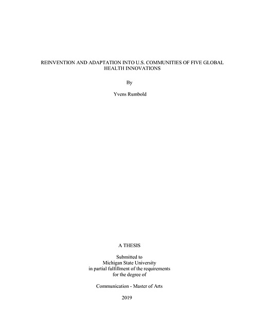 This thesis explores a distinction between types of changes made to innovations as they diffuse, based on the agents of those changes and the Diffusion of Innovations (DOI) framework: Reinvention by the designers of innovations and adaptations by the implementers of those same innovations. This research was conducted as part of a more extensive study of five global health innovations, conducted by researchers at the Department of Communication at Michigan State University and funded by the Robert Wood Johnson Foundation. A portion of the interview data from that project collected via interviews with innovation designers and researchers, on the one hand, and with community-based adopters and implementers, on the other, were transcribed and content analyzed to answer two compelling questions: What is the frequency of changes-counted as instances of reinvention and adaptation, as discussed by designers, on the one hand, and implementers, on the other? Which innovation attributes, and in what proportions, are discussed when designers and implementers address changes to innovations? Results suggest that both designers and implementers discuss reinvention and adaptation in the diffusion process. The changes discussed mostly concerned modifications made to the components of innovations, adjustments made in reaction to a different environmental context or target population, and the tailoring of content. Results suggest that interviewees referred mostly to the innovation attributes of compatibility (24.6% of the comments), relative advantage (12.1%) and observability (11.7%) when discussing changes. Achieving a fit with adopters' needs-compatibility-appears to be most important to innovation designers and the implementers of those global health innovations.