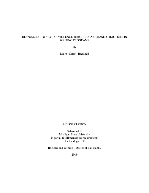 In Responding to Sexual Violence Through Care-Based Practices in Writing Programs, I articulate a trauma-informed, care-based (TI/CB) approach to writing program administration. Through an analysis of the First-Year Writing Program at Michigan State University, I argue that the incorporation of TI/CB methods in writing programs-and writing studies more broadly-can help shape ethical and informed responses to sexual violence. I suggest that a TI/CB framework is applicable not only as a response to crises once they become public, but also to address the already existing culture of sexual violence at every university.As I consider the intersection of writing program administration (WPA) work and institutional and personal trauma, I also use a TI/CB orientation to form both an analytic heuristic and a methodological framework. The practices that make up this framework are: promoting empathetic listening (Laub); building safe and open communities (Herman); encouraging storytelling (Pennebaker); reflecting on positionality and relationality (Powell et al.); rebuilding networks of trust and care (Morales); and centering survivors (Goodman and Epstein). Throughout the study, I consider how these practices already connect to the articulation of writing program values expressed by WPAs at Michigan State University.In addition to this analysis, I provide recommendations for the incorporation of TI/CB practices in both writing programs and writing studies as a field. This includes the development of self-assessment surveys for writing program administrators rooted in TI/CB values. In addition, I consider how a TI/CB framework could be adapted to create research methodologies rooted in trauma-informed care. Finally, I suggest that because of the unique position of WPAs between university administrators, teachers, and students, an enhancement of administrative practices through TI/CB methods could help form more ethical responses to campus sexual violence.
