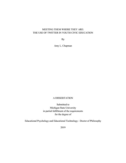 Many measures of youth civic engagement indicate that youth participation in civic life has long been in decline; however, some of these measures fail to take into account ways that youth interact and engage with civic life. This qualitative study explored the experiences of five high school social studies teachers who have used the social media platform Twitter with students in their teaching of civics. Data collected during in-depth interviews was analyzed using a two-step coding process: first, an open-coding phase of data analysis allowed for data to emerge without preconceived ideas influencing the data; and second, a theory-based coding phase of data analysis allowed for examination of how the collective perceptions and experiences of participants connected to a proposed model of constructivist teaching of civic education with Twitter. Findings showed that the participants were introduced to Twitter for educational purposes by an influential peer who provided support as teachers considered the affordances of Twitter for their teaching. The study's findings also showed that participants viewed citizenship as moving fluidly between online and offline spaces. Further, participants were concerned about their students' self-worth, and used Twitter as a means of amplifying student voice and foster student agency. These findings contributed to theoretical understanding of the use of social media in K-12 education as well as the use of social media in the teaching of civics. Further implications included suggestions for research on introducing social media for classroom use in both teacher education and professional development programs. Additional implications for research on the other ways in which teachers could support both online and offline civic engagement, the impact of the use of Twitter on student worth, and the impact of student worth on youth civic engagement are discussed. Finally, implications for teachers' adoption and use of social media for education are presented.