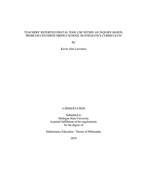 Mathematics teachers use various types of digital tools, including common mathematics-specific digital tools and general-purpose digital tools, in ways to support their instruction, student learning, and curricular goals. This study examined teachers' reported use of digital tools within units of an inquiry-based, problem centered curriculum to determine: (1) what digital tools teachers report using within problems in a unit and the manner of the use and (2) how those digital tools were used within problems and across problems in a unit. Inquiry-based, problem centered curricula provide opportunities to examine teachers' inclusion of digital tools within the mathematics classroom around a specific, common instructional method.Eight middle school teachers were selected based on self-reported moderate to high level of digital tool use and using the desired curriculum series. Each teacher described their use of digital tools on researcher selected problems during a single interview lasting approximately 1.5 hours. Digital tools were primarily used to: (1) support understanding the problem context through videos, (2) carry out straight-forward mathematical tasks through calculators and shared Google applications, (3) facilitate whole-classroom interactions through document cameras, other digital display devices, and shared Google applications, and (4) support summative use for recall, feedback, and artifact creation through video creation, written feedback applications, and shared Google applications. The four uses were strongly rooted in teachers' reported goals for the Launch-Explore-Summarize-Reflect instructional model and desired classroom-interaction characteristics. No notable differences in the use of digital tools were observed across problems at the investigation or unit level. The analysis suggests that teachers use digital tools to strengthen classroom-interaction of the instructional model. This work provides guidance for future consideration of the creation and inclusion of digital tools within inquiry-based, problem-centered mathematics curricula by outlining the types of digital tool uses and their purpose that are reported on through the various phases of individual problems.