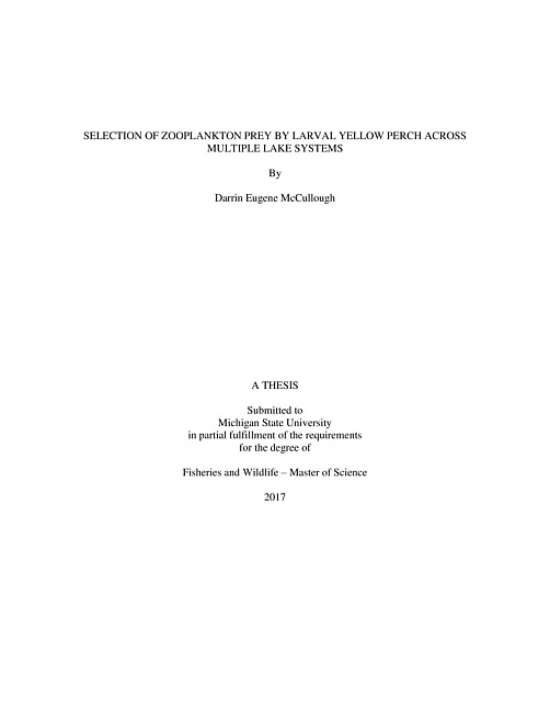 "Yellow perch Perca flavescens are widely distributed across North America where they inhabit a variety of aquatic ecosystems, playing an ecologically and economically significant role as both predator and prey. Like many fishes, successful recruitment of yellow perch depends on the availability of suitable densities and sizes of zooplankton prey at critical early life history periods. Thus, evaluation of prey selection may lend insight into processes driving year class strength. In order to assess prey selectivity, we collected larval yellow perch and zooplankton samples across a variety of inland lakes in Michigan's Lower Peninsula. The size structure of zooplankton taxa (e.g. Bosmina spp., cyclopoid copepods) was quite consistent across multiple system types, but zooplankton densities varied widely both within and between lakes. Selection for prey type and size varied in relation to fish size, but remained relatively consistent between eutrophic, mesotrophic and oligotrophic lakes. In my study lakes, I concluded that rotifers were not an important first food of larval yellow perch and analysis of prey selection patterns is confounded by a summative interaction of morphological limitations of the predators with behavioral preference for specific prey types within prey size classes. Additionally, I demonstrated that large numbers of samples were necessary to improve the level of confidence in measuring prey availability (e.g. density, species composition)."--Page ii.