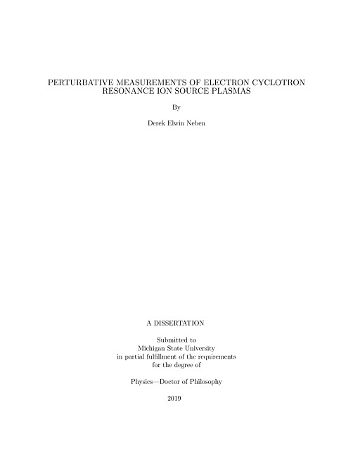 Heavy ion accelerators are a valuable resource for the nuclear science community to study atomic physics. One such heavy ion accelerator is the Coupled Cyclotron Facility (CCF) at the National Superconducting Cyclotron Laboratory (NSCL) which relies on Electron Cyclotron Resonance (ECR) ion sources to provide the primary beam to the target. ECR ion sources are essential for the efficient operation of research accelerators such as the CCF, providing high currents of highly charged ions. Highly charged ion beams increase the efficiency of the accelerators, but require longer confinement times and higher temperature plasmas in the ion sources than is necessary to produce singly charged beams. The need to use high temperature and low density plasmas creates challenges including those relating to plasma stability. ECR ion sources provide a good platform to accept metallic vapor ovens and sputtering probes allowing the CCF to accelerate up to 30 types of beams ranging from oxygen to uranium. Furthermore, ECR ion sources use no filaments or cathodes providing a high degree of reliability for the accelerator facility. As the intensity frontier demands ever rarer isotopes from accelerator facilities, the heavy ion beam intensity must increase [70], which creates new demands from the ion sources.The work presented within this dissertation set out to better understand the mechanism that confines highly charged ions in the ECR plasma. Specifically, it was explored if hot electrons (energy larger than 50 keV) contribute to ion confinement by generating an electrostatic well in the plasma potential [68]. Perturbative measurements of ECR ion sources are presented with the aim to explore ion confinement times: pulsed sputtering (Chapter 4) and amplitude modulation (Chapter 5). Chapter 3 explores the geometry of the sputtering probe with respect to the magnetic field which was crucial to produce reliable pulsed sputtering results on the ECR ion source. Axial pulsed sputtering, which could be conveniently implemented on fully superconducting sources, incorporated a bias disc effect that highly perturbed the plasma. Radial sputtering was emulated by placing a semi-shielded probe along the plasma chamber wall in between the electron loss surfaces.Ion confinement time was characterized through the decay time of the beam current, which is proportional to ion confinement time. Ion beam decay times were measured for different charge states of gold in an oxygen plasma in Chapter 4. Decay time always increased with increasing charge state. Decay time also increased with hot electron temperature for lower frequency operation (13 GHz), but reached an optimized value for higher frequency operation (18 GHz) due to plasma instabilities. Electrostatic confinement of ions appeared to be the most plausible mechanism to explain the observed decay time behaviors. A novel perturbative measurement technique was developed for ECR ion sources using Amplitude Modulation (AM) of microwave power. The AM measurement was originally motivated by whether or not 50k0303Hz modulation in microwave power (from the microwave source) would be observable in the beam current. A systematic study was organized on the University of Jyvaskyla Physics Department (JYFL) normal conducting ECR ion source in Jyvaskyla Finland. Chapter 5 presents the beam current response to AM on the 14 GHz ECR ion source for different weights of noble gases, magnetic fields, and vacuum pressures. The beam current amplitude generally decayed exponentially for frequencies higher than around 400 Hz with the modulation highly suppressed at 10 kHz.