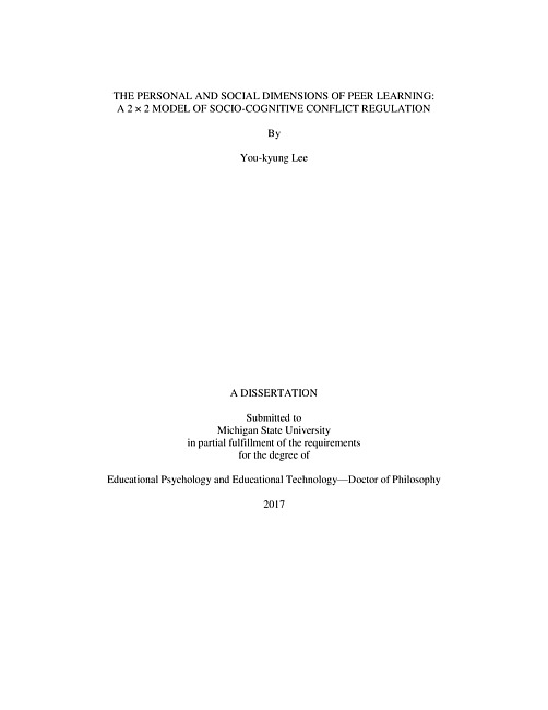 The purpose of this dissertation study is to investigate the 2 × 2 socio-cognitive conflict regulation framework, with a particular focus on a new construct of concurrence-seeking epistemic regulation, characterized by students' compliance with others' views without experiencing any contradiction. I also examined how perceived competence and social interdependence (i.e., cooperative and competitive contexts) are associated with a range of student outcomes including socio-cognitive conflict regulation (a) in experimental studies using vignettes describing working with the other employee in a workplace (Pilot Study, Study 1) and (b) in a field study by asking undergraduates about group-work experiences in their real classroom (Study 2). Pilot Study (N = 201) and Study 1 (N = 504) provided empirical support for the existence of concurrence-seeking epistemic regulation as a new type of socio-cognitive conflict regulation, along with the validation of the 2 × 2 socio-cognitive conflict model, by evidence of factor structure, reliability of each measure, intercorrelations between the measures, and the effects of competence and social interdependence on each type of regulation. There were significant interactive effects of competence and social interdependence on constructive-epistemic and competitive-relational regulations in both Pilot Study and Study 1. Study 2 (N = 254) confirmed utility of the new measures of socio-cognitive conflict regulation in an actual undergraduate classroom by replicating their factor structure, reliabilities, and convergent and divergent validities from Pilot Study and Study 1. Furthermore, I examined structural relations among different types of students' socio-cognitive conflict regulations and their antecedents (i.e., competence, social interdependence, achievement goals) and consequences (i.e., behavioral engagement/disengagement, critical reasoning), and tested interactive effects of perceived competence and social interdependence using latent moderated structural equations approach. There were significant interactive effects of competence and cooperative perceptions on concurrence-seeking epistemic and protective-relational regulations, and a significant interactive effect of competence and competitive perceptions on protective-relational regulation. The interaction results indicate that as competence is higher, higher cooperative perceptions lead to even lower concurrence-seeking epistemic and protective-relational regulations. And, as perceived competence is higher, higher competitive perceptions lead to even lower protective-relational regulation. In addition, constructive-epistemic regulation showed the most adaptive learning outcomes in terms of behavioral engagement and critical reasoning. This dissertation study's findings refine conceptual model of socio-cognitive conflict regulation and shed light on both social interdependence theory and socio-cognitive conflict theory. They also provide more specific guidance for peer learning instructions to promote students' cognitive development.