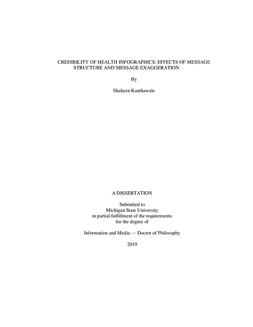 In an era of misinformation facilitated in large volumes through social media, infographics act as a bite-sized visual medium created for the express purpose of spreading complex information in an easy-to-digest format. The popularity of visual content on social media is increasing every day, and as a first step to curb the spread of visual misinformation online, it is vital to understand how people determine its credibility. This is because credibility often acts as a precursor to behaviors and most existing literature focusing on credibility either delves into text-based content or the design of platforms.An acknowledged gap in credibility research is message credibility. Credibility research has, instead, often focused on the ever-popular source credibility, with volumes of it exploring both, offline and online source credibility. Where misinformation can reach people through many different ways, the internet has exacerbated its effects, in that the source of a message may not, in fact, be a viable option for people to use in order to determine credibility. A large volume of content on the internet is visual (as opposed to text-based), and this dissertation delves into how past credibility research can be applied to more visual messages.Considering an infographic to be a single message, determinants of message credibility were mapped onto a visual platform (infographics). Through two studies-one focusing on the structure of the message and the other on exaggeration of its message-the credibility of three health infographics were determined.The results indicated that the structure of the health infographic did indeed play a role in its message credibility determination. The importance of this structure is discussed through the lens of its importance in creating a narrative for the health infographic. Message exaggeration was also found to have an effect on message credibility, thus indicating the possible effect of having unbiased or opinionated visual messages. The moderating effect of prior assumptions about manipulated content were also found. Findings and implications are discussed.