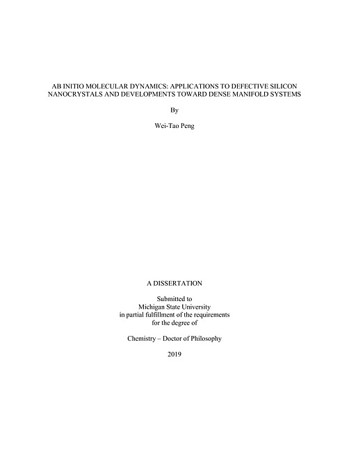 Ab initio molecular dynamics : applications to defective silicon nanocrystals and developments toward dense manifold systems
