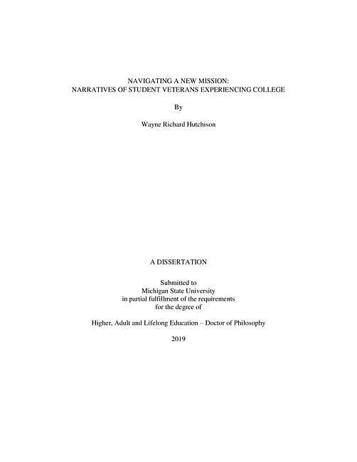 Many student veterans have experienced challenges in their college careers. To date, most academic literature on student veterans has focused on aspects of their transition to college, including financial and administrative needs, pursuing connections to other student veterans as an ideal peer group, high-risk behavior, hypervigilance and combat-related injuries (Ackerman, DiRamio, & Mitchell, 2009; Barry, Whiteman, & MacDermid Wadsworth, 2012; Bauman, 2013). Less research, however, has focused on how student veterans experience college post-transition, to include potential impacts of their past military experiences on their journeys as college students.Impressions vary in current literature as to how salient military experience is to student veterans as they progress through college. While some scholars suggest that these experiences erode over time (Naphan & Elliott, 2015), others believe these behaviors shape veterans well after their transition from service to college (DiRamio & Jarvis, 2011; Jones & Abes, 2013). Given the uniqueness of their backgrounds, student veterans require specific programming to serve their needs in college (Barry, Whiteman, & Wadsworth, 2014; McCaslin, Leach, Herbst, & Armstrong, 2013). Despite these acknowledgements, academic literature still largely summarizes military backgrounds, with no identified differences between individuals. An increasing lack of civilian understanding of these experiences (Jones, 2013) creates additional support challenges for this population, as faculty and staff are not being trained to understand the diversity of student veteran experiences (Osbourne, 2014).This study sought to expand the knowledge of student veteran experiences through a thematic analysis of military and college experiences. To accomplish this, qualitative research practices informed by narrative inquiry were used (Claindinin & Connelly, 2000; Merriam & Tisdell, 2016) to guide questions to student veterans about their military and college lives. Participants were a sample of student veterans attending a large, midwestern institution, with defined student veteran support resources. This study offers thirteen participant narratives of military and college experiences. These narrative sketches largely connected to four themes that depict transactional educational experiences for adult learners, comprised of experience gaps with non-veteran stakeholders, college social and cultural challenges, reflections on past military experiences as well as thoughts on the utility of relationships with other student veterans. This work is valuable for practitioners seeking to improve their understanding of student veterans through their military and college experiences.