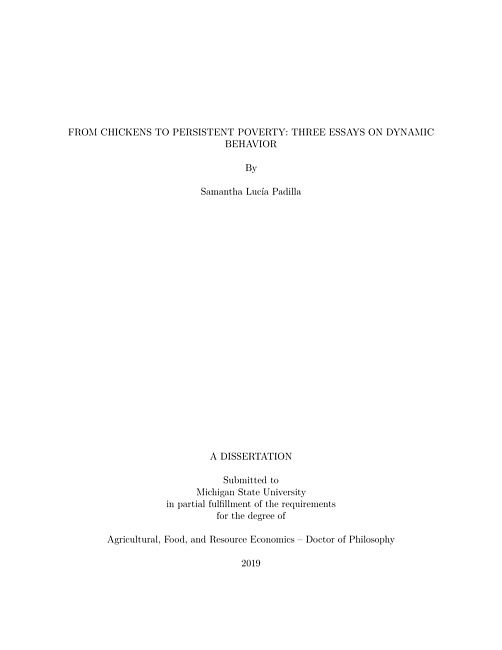 My dissertation research applies dynamic optimization and panel-data methods to study household welfare in the United States and broiler poultry farms in Nigeria. The first chapter examines if persistent poverty among subpopulations in the United States can be explained by a poverty trap. Using panel data spanning over 40 years (1969-2017), we employ the most current nonparametric, semiparametric, and parametric estimation methods to test for a poverty trap. Our results indicate that there is no multiple equilibrium poverty trap in the United States generally, nor among female and black headed households. We find a single stable equilibrium that varies by the race and gender of the household head but is always above the U.S Census poverty line. These results are consistent across estimation methods and time periods. However, we find strong evidence of conditional convergence across subpopulations in the United States. We consistently observe black-headed households converging to significantly lower equilibrium than white-headed households. We also find some evidence of a gap between female and male headed households. While conditional convergence for blacks is robust to the choice of method or time period, for female headed households the income gap is shrinking, consistent with improvements in the gender wage gap.Chapters 2 and 3 focus on optimal decisions of commercial poultry farms in Nigeria using a discrete time and space dynamic programming (DP) algorithm, disaggregated by firm size. In Chapter 2, we explore the profitability of commercial farms facing rising input costs and increasing energy needs due to the adoption of climate mitigating technologies. Using a cross-sectional dataset and a one-year weekly panel of farm inputs and prices, we employ a dynamic programming model to determine the source of economies of scale among commercial poultry farms. In the presence of high feed costs and increased energy needs, the optimal strategy for medium sized farms is to sell and exit the industry. However, it remains profitable for large firms to stay in the sector. The findings are robust to various alternative model assumptions and specifications. They indicate that broiler farms need larger flock sizes to withstand negative input price shocks and expand energy consumption in the face of volatile and hotter temperatures. The sensitivity of the poultry industry to changes in feed prices is a major threat to the growth and survival of farms and highlight the importance of developing risk management mechanisms to counteract the effects of unstable prices. Chapter 3 examines the effect of electricity supply fluctuations on poultry farmer storage and freezer investment decisions. We combine a replacement and storage model to derive optimal storage rules. Then, we use expected cash flows from the model to derive freezer investment rules under uncertainty, due to fluctuating electricity supply and stochastic broiler and diesel prices. We find evidence that poultry farmers would use the storage option to take advantage of arbitrage opportunities and price premiums, but poor electricity supply hinders this. Despite positive gains from storage, freezer investments are not an optimal strategy due to high freezer costs and the need for generator use to complement poor electricity supply. The findings of this research (and its implications) are applicable across developing countries in Africa and Latin America that face scarce electricity supply and are in the process of expanding commercialized agricultural value chains as a way to increase farm incomes and stimulate economic growth.