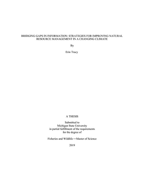 "The Great Lakes region has an abundance of natural resources that are ecologically and socioeconomically valuable yet threatened by changing climate. To effectively address impacts of climate change within the Great Lakes region will require managers to mitigate the causes of climate change as well as adapt to current threats and to future changes in both social and ecological systems. This thesis addresses those needs by providing natural resource managers with strategies to increase support for climate change mitigation policies and by providing them with information on how social and ecological systems may change with changing climate so that they can develop and apply novel management strategies. Results from Chapter 1 show that while Michigan conservation organizations vary in their current engagement with climate change issues and in their willingness to increase engagement with their membership depending on perceived barriers, every organization expressed interest in receiving more information on how climate change will affect the state's fish and wildlife populations. In Chapter 2, we characterized how resilient Michigan river fish habitat may be to anticipated changes in climate. Our results indicate that while cumulative resilience is generally higher in the Upper Peninsula and in the Northern Lower Peninsula, resilient streams are also found in the Southern Lower Peninsula, suggesting that managers have opportunities in every part of the state for protecting and/or improving stream resiliency to changing climate. Collectively, outcomes of this research offer managers new information and strategies for mitigating and adapting to climate change, ultimately facilitating the sustainable management of natural resources in a changing climate."--Page ii.