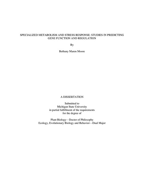 "One of the longstanding challenges in biology is to connect the wealth of genome data to the phenotypes it encodes. In plants, phenotypes can encompass a variety of traits, but one of interest is that of specialized metabolism, or the production of compounds unique to only specific lineages of plants rather than all plants. This interest comes from the wide range uses of specialized metabolites from defending a crop plant against insect herbivory to using the plant compound as a base for pharmaceuticals. The challenge faced is that due to their high diversity, among other reasons, the genes underlying the process of making specialized metabolites are not well characterized. In addition, specialized metabolism pathways can be induced by stress, however it is unclear how most SM pathways and stress responsive genes are regulated. Therefore, the research in this dissertation focuses on 1) How to identify the function of genes as being involved specialized metabolism 2) What characteristics are shared among specialized metabolism genes (SM genes) 3) How are SM genes and genes involved in response to stress regulated?For the first two questions, chapters 2 and 3 use machine learning modeling to predict specialized metabolism (SM) genes in Arabidopsis thaliana and Solanum lycopersicum (tomato). A shared set of characteristics emerges as being important that includes expression features under biotic stress and in specific tissue types. Additionally, evolutionary and duplication characteristics were important where SM genes tend to be recently and tandemly duplicated, as well as less conserved than genes not in SM pathways. Using these characteristics to build a machine learning model, 85.6% of SM genes in A. thaliana and 76.6% of SM genes in tomato were correctly predicted. Additionally, we show that the superior annotation in A. thaliana is able to make cross-species predictions in tomato as well as improve SM gene predictions relative to the model based only on tomato annotation. The improved model predicts 92.4% of SM genes in tomato correctly. Finally, machine learning is used to predict SM genes to a specific pathway.For the third question, chapter 4 uses machine learning to predict how response to wounding stress is regulated and what regulatory elements are important for an SM pathway that is activated by stress. Important putative cis-regulatory elements were identified for genes differentially expressed under wounding stress and temporal patterns of regulation were discovered. Using machine learning, these putative cis-regulatory elements were found to be important in driving differential expression of genes at different time points after wounding. Additionally, regulatory elements were mapped to the genes in the SM pathway glucosinolate biosynthesis from tryptophan to determine element important for the regulation of this pathway under wounding stress. In this dissertation I examine computational approaches to identify gene function and regulatory mechanisms, highlighting the fact that machine learning can be a powerful tool to make challenging predictions."--Pages ii-iii.