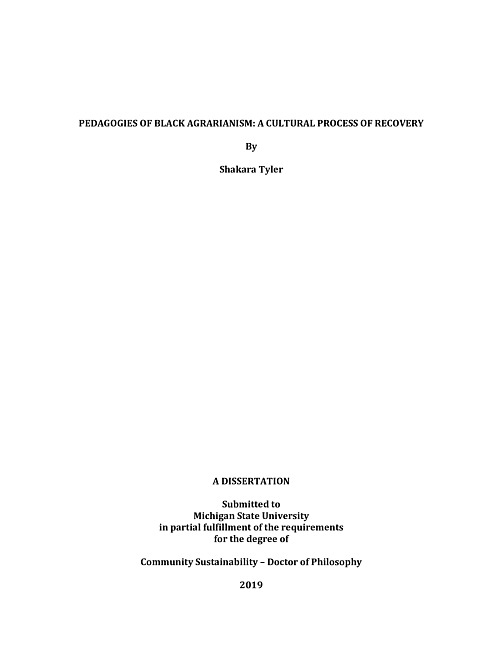 "Black agrarianism is a pedagogical thought, praxis, and social movement. Black agrarian pedagogies are the processes by which we teach and learn with one another through the exchange of knowledges that range from basic survival necessities on how to feed, shelter, and cloth ourselves to cultural stories that affirm our identities and value as dignified human beings. The abundant literature citing black agrarianism as a form of social, economic and political liberation skims the surface of educational processes in black agrarian spaces. In response, this inquiry explores the historical, contemporary and self-reflective pedagogies of black agrarianism.The historical pedagogies of black agrarianism are interrogated through a two-part historiography: a historiographical essay and an oral history theatrical representation. The historiographical essay illuminates the mothering of black agrarian pedagogies that creatively crafted black agrarian educational environments through the late 19th and 20th centuries in institutions such as Tuskegee University and the Black Panther Party. In the tradition of African storytelling, the oral history theatrical representation performs the life history of Wendell Paris, a black agrarian organizer and educator, in dialogue with historical black agrarians such as Booker T. Washington, George Washington Carver and Fannie Lou Hamer to portray the importance of culture as the first and most important teacher where every day acts of shelling peas, organizing for black voting rights and learning how to survive were some of the primordial lessons that captured the Black Freedom Movement of the mid-to-late 20th century. Relatedly, the ethnographic case study of D-Town Farm of the Detroit Black Community Food Security Network (DBCFSN) explores the contemporary contours of black agrarian pedagogies. Through participant observation, semi-structured interviews with 12 farm volunteers and 7 D-Town farmers and interns and content analysis via internal documents and social media postings, I interpret D-Town Farm pedagogy as a spiritually-driven praxis that exists in a culturally-representative community village striving toward self-reliance. By bringing everything full circle, the farm facilitates a culture of belonging (hooks, 2009) through African-centered culture as a pedagogical agent. Lastly, the self-reflective pedagogies of Black agrarianism are contextualized via an autoethnography where I reflect on my understandings of how black agrarian pedagogies has impacted me as a researcher."--Pages ii-ii.