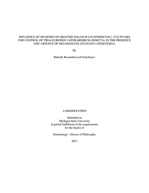 Solanum lycopersicum L (tomato) is native to South and Central America. It is grown world-wide on about ten million acres, yielding circa 185 million tons of fruit on an annual basis. To make this crop available on a year-round basis, greenhouse tomatoes are commonly grown in countries such as the Netherlands, Canada and Uzbekistan. Tomato is the second staple vegetable in Central Asia after potato. About four million tons were produced in Central Asia in 2013. Tomatoes are eaten raw or cooked and are rich in essential vitamins and minerals. Their color comes from lycopene, which is responsible for the antioxidants reported to alleviate risk to human health issues such as heart disease, hypertension, congestive heart failure, prostate cancer and atherosclerosis.Tomato can be susceptible to numerous insect pests and infectious disease pathogens. Tomato hornworm (Manduca quinquemaculata), cotton bollworm (Helicoverpa armigera), corn earworm (Helicoverpa zea), potato aphid (Macrosiphum euphorbiae), green peach aphid (Myzus persicae), silver leaf whitefly (Bemisia tabaci), and greenhouse whitefly (Trialeurodes vaporariorum Westwood) are key insect pests of tomato. Whitefly is important because of its ability to cause direct feeding damage and vector viruses such as tomato yellow leaf curl virus (TYLCV) of the begomovirus genus.Numerous tomato cultivars have been developed for desirable, pest, horticultural and food attributes. Some have been adopted for their pest or pathogen resistance characteristics. For example, Anahu is a determinant tomato cv that has the Mi gene which confers resistance to southern root knot nematode (Meloidogyne incognita (Kofoid & White) Chitwood), and cross-resistance to potato aphid (Macrosiphum euphorbiae (Thomas)) and sweet potato whitefly (Bemisia tabaci (Gennadius)). Not all resistant tomato varieties, however, are suitable for tomato production, or preferred by farmers and consumers. Grafting has the potential to bring all the essential traits together.Grafting is a practice used in vegetable production systems to decrease risk to soil-borne diseases, increase salt tolerance, increase tolerance to other abiotic factors, increase drought tolerance, increase plant vigor, and increase yield. The research presented herein was aimed at determining if the grafted susceptible tomato cv Rutgers on top of resistant tomato cv Anahu will control two important tomato pests. Moreover, we measured plant biomass (fruit, stem and leaf, and root) of these two tomato cultivara with and without grafting in order to evaluate grafting impact on plant biomass allocation. Also, we counted the Type-D trichome density as these structures are thought to be responsible for pest resistance by acting as mechanical and chemical barriers.The results show that Anahu is not a good tomato cultivar to control M. incognita and T. vaporariorum. Anahu was not completely resistant to M. incognita. Moreover, on Anahu, significant decrease in T. vaporariorum population density occurred only when the M. incognita was present. Type-D trichome density was not responsible for a reduction of T. vaporariorum population density on Anahu. Thus, in order to draw a strong conclusion about Mi gene resistant to T. vaporariorum and resistance translocation from the rootstock to scion in grafted plants, there is a need for more advanced research, including molecular studies.