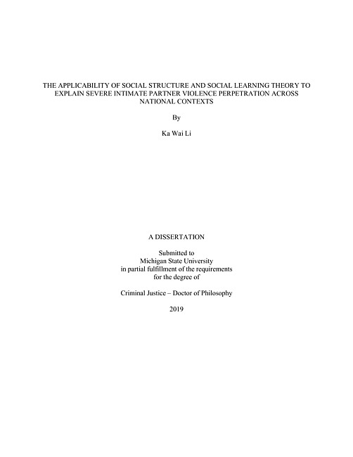 "Intimate partner violence (IPV) affects men and women worldwide. Previous research on IPV perpetration suggested a number of individual-, interpersonal-, and contextual-level risk factors. Despite this large body of research enhancing our understanding of IPV perpetration, there is still a lack of a comprehensive examination of the etiology of IPV. Researchers have called for a contextual and systematic approach that acknowledges the influence of multilevel forces on IPV perpetration. Therefore, the current study aims to examine the applicability of Aker's Social Structure and Social Learning (SSSL) theory to explain severe IPV perpetration. SSSL theory is a multilevel integrated theory that links structural level factors to IPV perpetration through a social learning process. In other words, the current study tests the mediation effect of the social learning process on the connection between social structural factors and IPV perpetration. Data on IPV perpetration by both male and female college students in 30 nations were taken from the International Dating Violence Study, which also included social learning variables. Structural level indicators of gender equality for individual nations were taken from Global Gender Gap Index, which provides a multi-faceted indicator of gender equality. Because the students are nested within countries, multilevel regression models were used. Findings suggest that national-level gender equality is partially mediated by definitions favorable to breaking the law; a component of SSSL theory. However, other components of the social learning process, such as differential association, differential reinforcement, and imitation, were not found to have mediating effects. Therefore, the findings only partially support SSSL theory that social learning variables mediate the effect of gender equality on IPV perpetration. Implications of the findings are discussed."--Pages ii-iii.