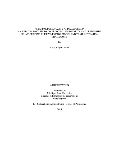 "This dissertation is a mixed-methods exploratory study on the relationship between principal personality and principal behavior. The study used the Five-Factor Model to analyze the principal position to determine if there might be links between a principal's personality and their thoughts and behaviors. This study used survey and interview data from principals in Michigan to identify possible relationships and provide an outline with which to study principal personality and leadership behaviors in the future. This paper also contributes to the Trait Activation Framework with a focus on the education leadership position. Findings show that the principal sample represented higher Agreeableness and Conscientiousness, which aligns with previous research, which suggests higher consensus building and focus on accomplishing goals would appear in leadership positions such as the principal position. The findings showed many similarities in attitudes and prioritization across the principal sample with a primary focus on students, supporting teachers, building trust, using teacher teams, and the need for mentors and other colleagues to support new principals. Finally, the findings suggest that personality traits may factor into how principals strategize to gather information for decision making and implementation of those decisions."--Page ii.