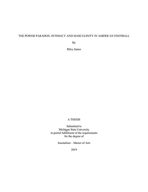 This thesis examines how intimacy-both physical and emotional-in American football affects masculinity. This research is important because it questions the role of masculinity in a sport considered the most popular in terms of participation, attendance at games, and broadcast viewership (Miaschi, 2017). Theories such as hegemonic masculinity theory and inclusive masculinity theory are used to explain how masculinity is constructed through football. Using naturalistic observation, interviews with seven Michigan State University (MSU) football players, and an analysis of photographs, I found these football players have more intimate relationships with other players on their team when compared to relationships they have with other men outside their sport. Some surprises I found during interviews was that injury during football is not treated as harshly as it once was and one player views being emotional as an important part of being a man. I visually present the intimate aspects of football I witnessed in photographs I created as an employee of Big Ten Network during MSU football games during the 2017 and 2018 seasons, and I offer my analysis of intimacy and masculinity in this sport that includes and explains the meaning behind the power paradox.