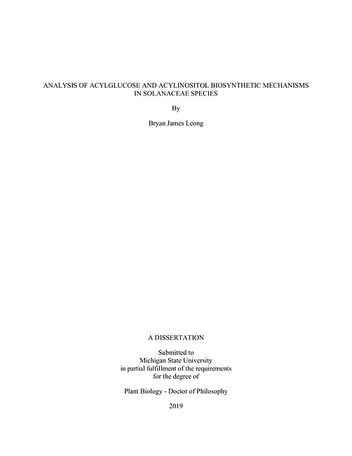 Plant specialized metabolites are compounds produced in specific lineages whose synthesis most likely arose as adaptations to specific ecological conditions. One group of these compounds are acylsugars, which are produced in the glandular trichomes of many species in the Solanaceae family. Research indicates that differences in acylsugar core and acyl chains alter the effects of these compounds on insect deterrence or mortality. We can use natural chemical diversity to study what effects different acylsugars have on insects using in vitro techniques, but in planta methods are preferred. Identification of biosynthetic genes allows us to genetic engineer these pathways into plants to more precisely study the impact of these compounds in planta. This study is comprised of two projects characterizing biosynthetic pathways present in Solanum pennellii and Solanum quitoense. We are interested in how acylglucoses are made in S. pennellii-the first project focused on identification of an acylsucrose fructofuranosidase in S. pennellii, a wild relative of cultivated tomato. This S. pennellii glycosyl hydrolase converts acylsucroses to acylglucoses, the predominant acylsugar in several accessions of this species. In vitro and in planta data show this enzyme accepts S. pennellii P-type acylsucroses as substrates, but not F-type acylsucroses from cultivated tomato. Whether the plant produces P- or F-type acylsucroses is determined by different enzymatic activities of acyltransferases that alter acylation pattern in cultivated tomato and S. pennellii-representing a three gene epistatic interaction between those genes and the acylsucrose fructofuranosidase. Acylinositols represent a novel type of acylsugar produced in the Solanum genus, however, the biosynthetic pathway has not been studied. My second project involved characterization of the biosynthesis of these myo-inositol containing acylsugars in Solanum quitoense. VIGS analysis suggested this BAHD acyltransferase acetylates triacylinositols and in vitro analysis confirmed that hypothesis. Further VIGS analysis and in vitro assays identified an inositol acyltransferase that possessed characteristics matching other acylsugar biosynthetic enzymes, but this BAHD acyltransferase acylated myo-inositol at an aberrant acylation position. Alternative hypotheses were offered to reconcile the in vitro and in vivo results. Together, these two projects represent first steps towards understanding how the array of acylsugars in Solanaceae species are produced.
