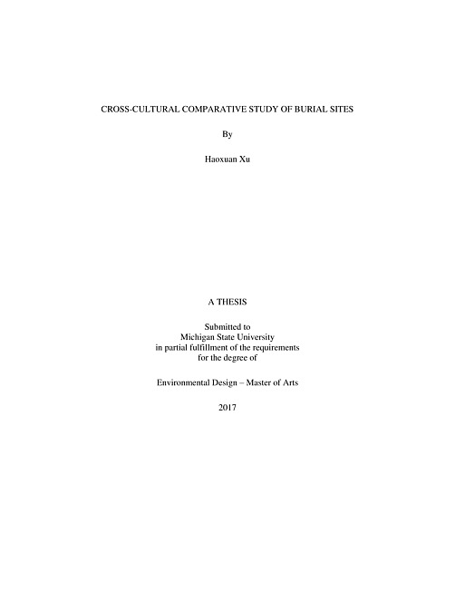 "Burial grounds, as one of the most important landscape that connect the living and the dead, can often represent culture, tradition and aesthetic evaluation of a local community; therefore, understand the similarities and differences among the burial sites can help people understand the culture and tradition of places behind the burial sites. This research studies the similarities and differences among different Western and Chinese burial sites, including Pere Lachaise in Paris, three municipal cemeteries in Michigan, USA, three public cemeteries in Shanghai, China, Two Chinese imperial tombs in Nanjing, China, and two rural ancestral burial grounds in Jiangsu, China." -- Abstract.